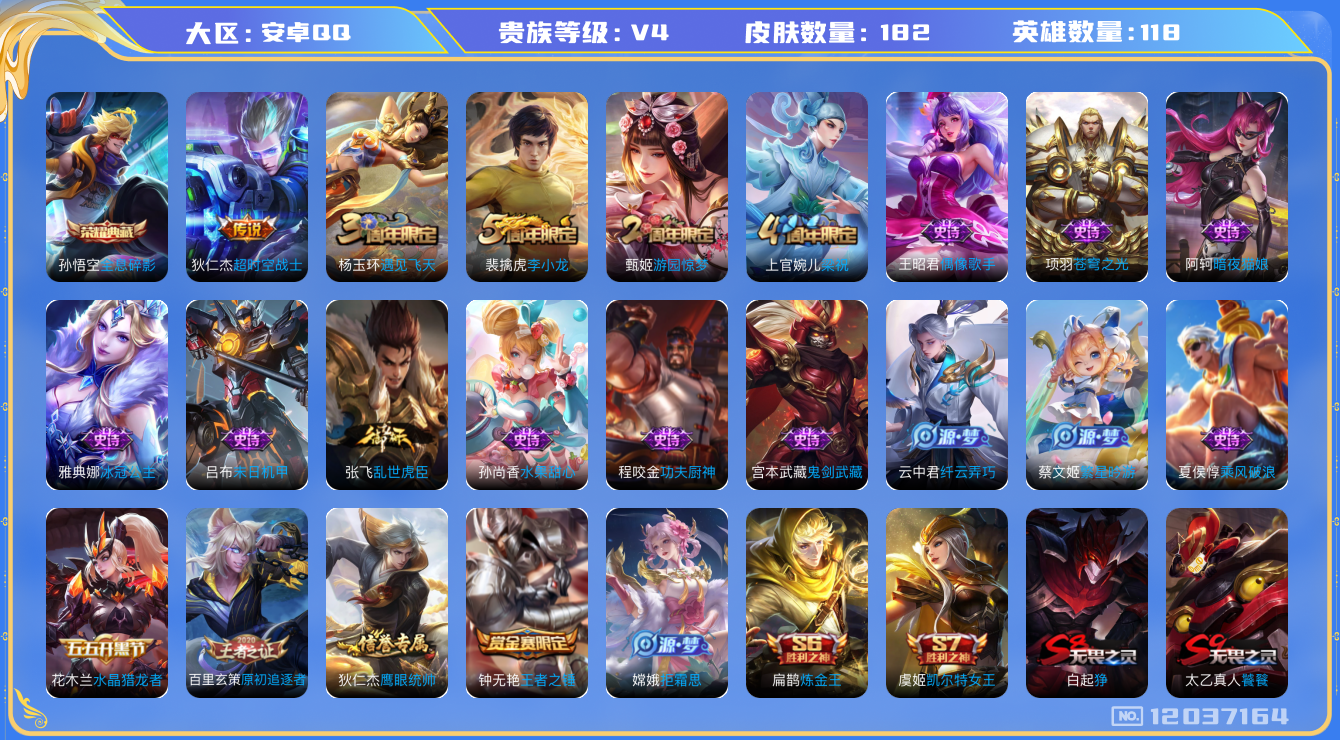 [12037164]【暑期末清货/特价急出/永久包赔/商品详情看图】:安卓Q-V4-尊贵铂金I段位-118英雄-182皮肤-1典藏-1传说-31史诗