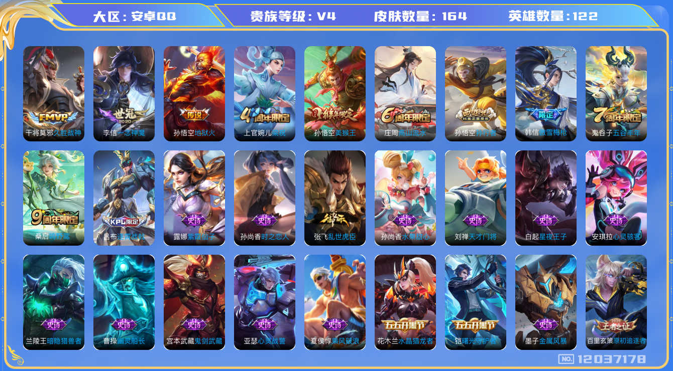 [12037178]【暑期末清货/特价急出/永久包赔/商品详情看图】:安卓Q-V4-永恒钻石II段位-122英雄-164皮肤-4传说-40史诗【传说皮肤】:孙悟空地狱火,干将莫邪久胜战神,李信一念神魔,桑启鸣野蒿【限定皮肤】:庄周高山流水,芈月幻夜卜梦,元歌无心,狄仁杰魔术师,韩信傲雪梅枪,孙悟空美猴王,孙悟空孙行者,后羿圣弓游侠,李元芳云中旅人,干将莫邪真爱魔法,鬼谷子五谷丰年,黄忠火炮绅士,上官婉儿梁祝,鲁班大师探海日志【年限皮肤】:孙悟空美猴王