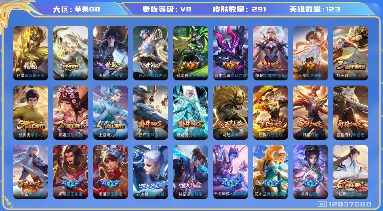 [12037680]【暑期末清货/特价急出/永久包赔】:苹果Q-V8-永恒钻石IV段位-123英雄-291皮肤-15传说-90史诗