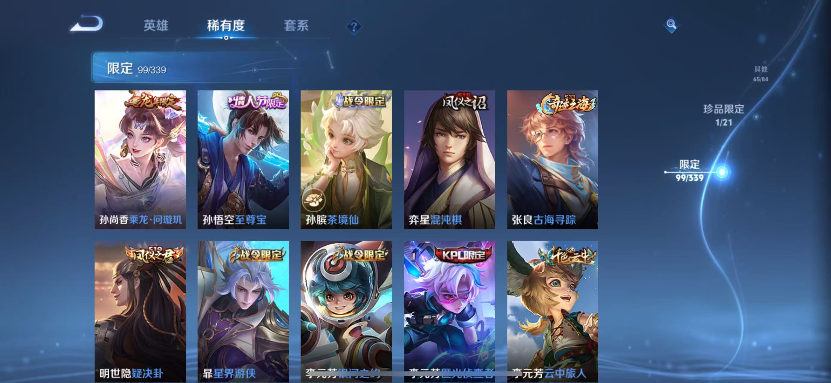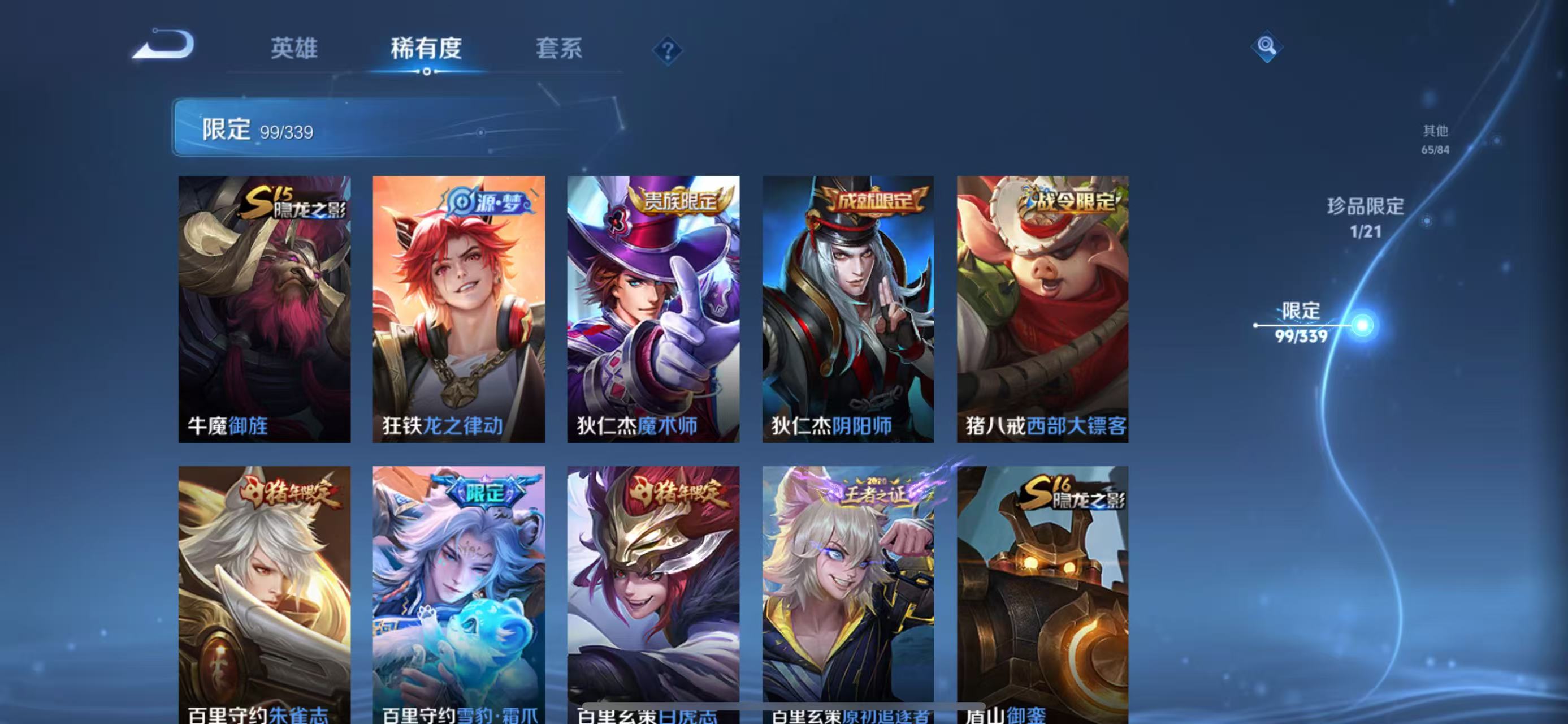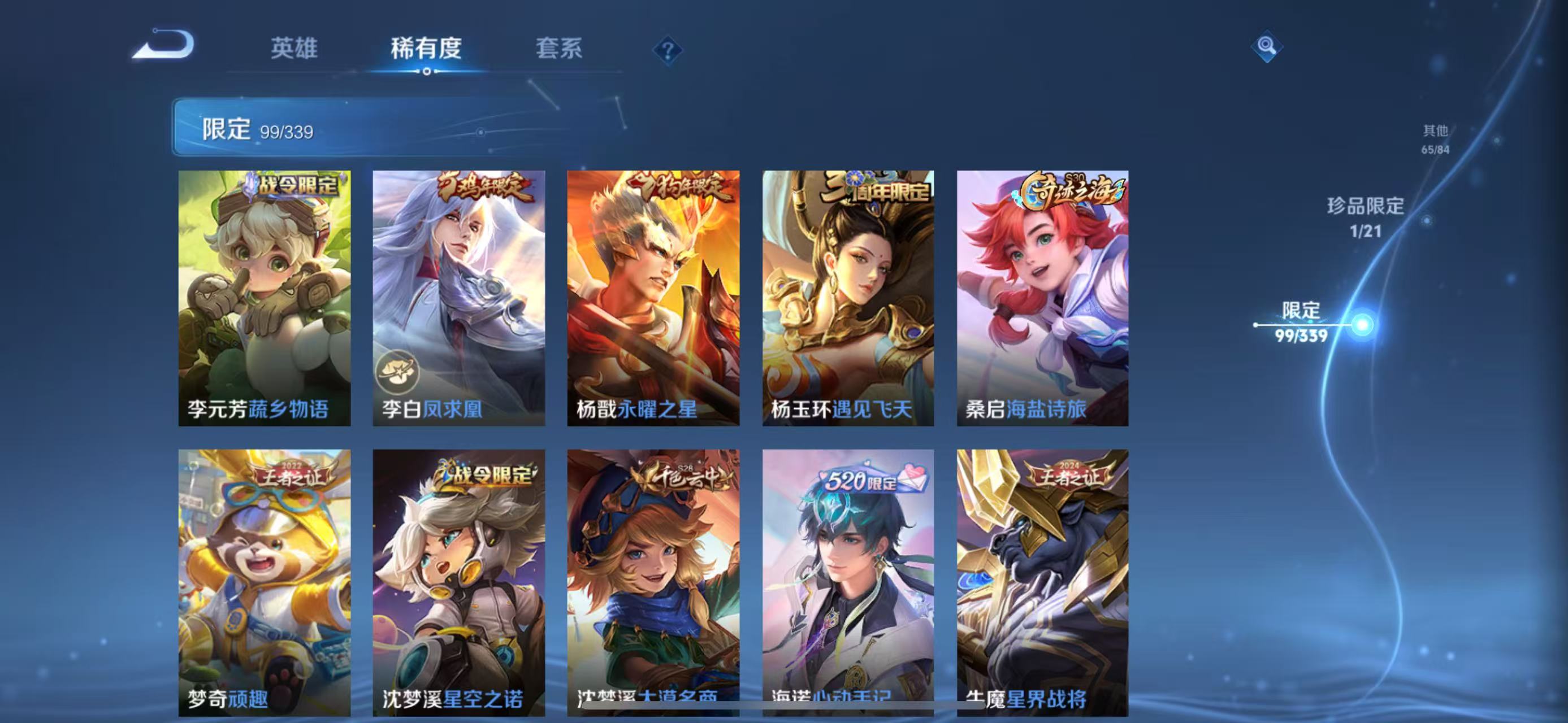 张良古海寻踪,桑启海盐诗旅,裴擒虎擒涛扼浪,鲁班大师探海日志,镜青焰无极,项羽苍威无极,米莱狄御霄,牛魔御旌,盾山御銮,夏侯惇朔风刀,弈星混沌棋,明世隐疑决卦,老夫子醍醐杖,鬼谷子原初探秘者,吕布猎兽之王,女娲朔望之晖,典韦蓝屏警告,沈梦溪星空之诺,李元芳银河之约,刘邦夺宝奇兵,马可波罗暗影游猎,蒙犽狂想玩偶喵,沈梦溪大漠名商,李元芳云中旅人