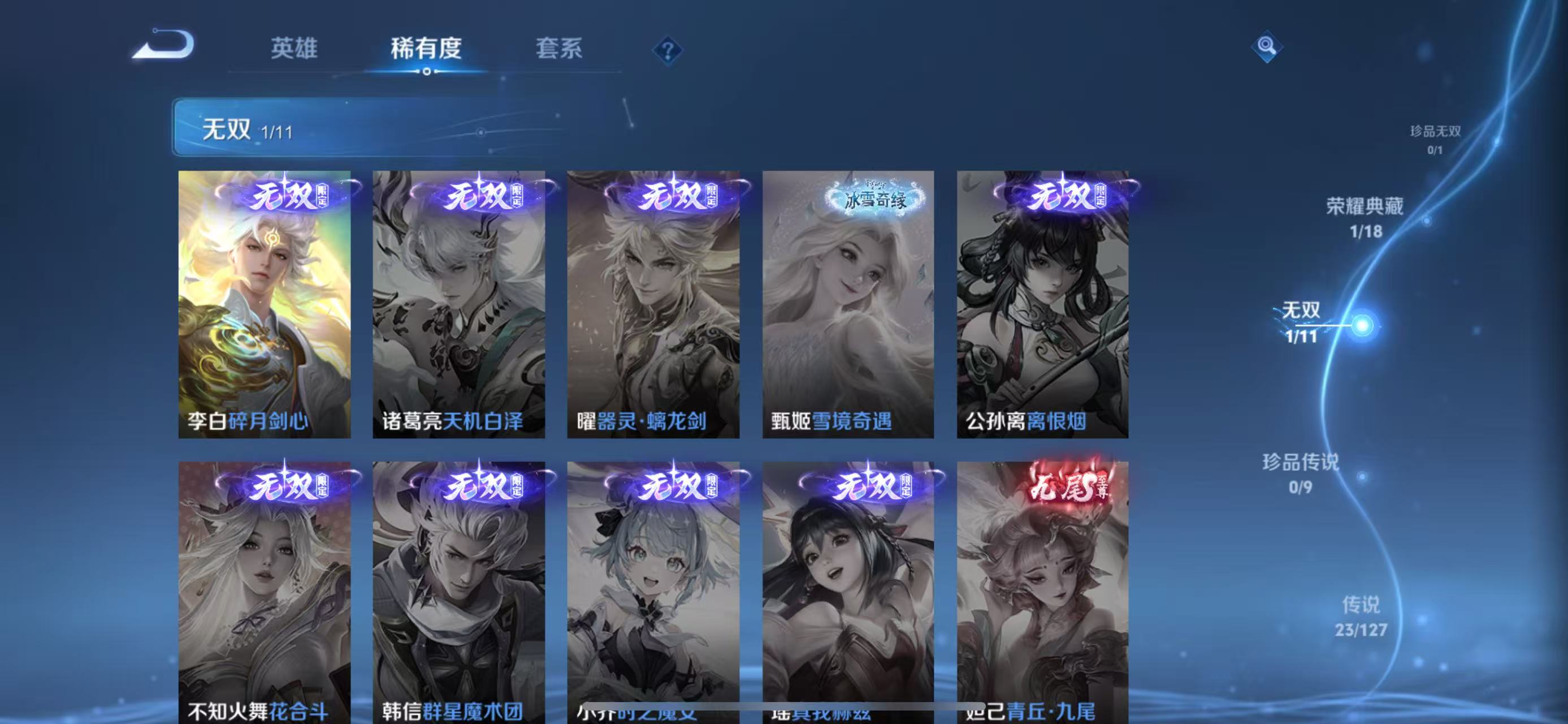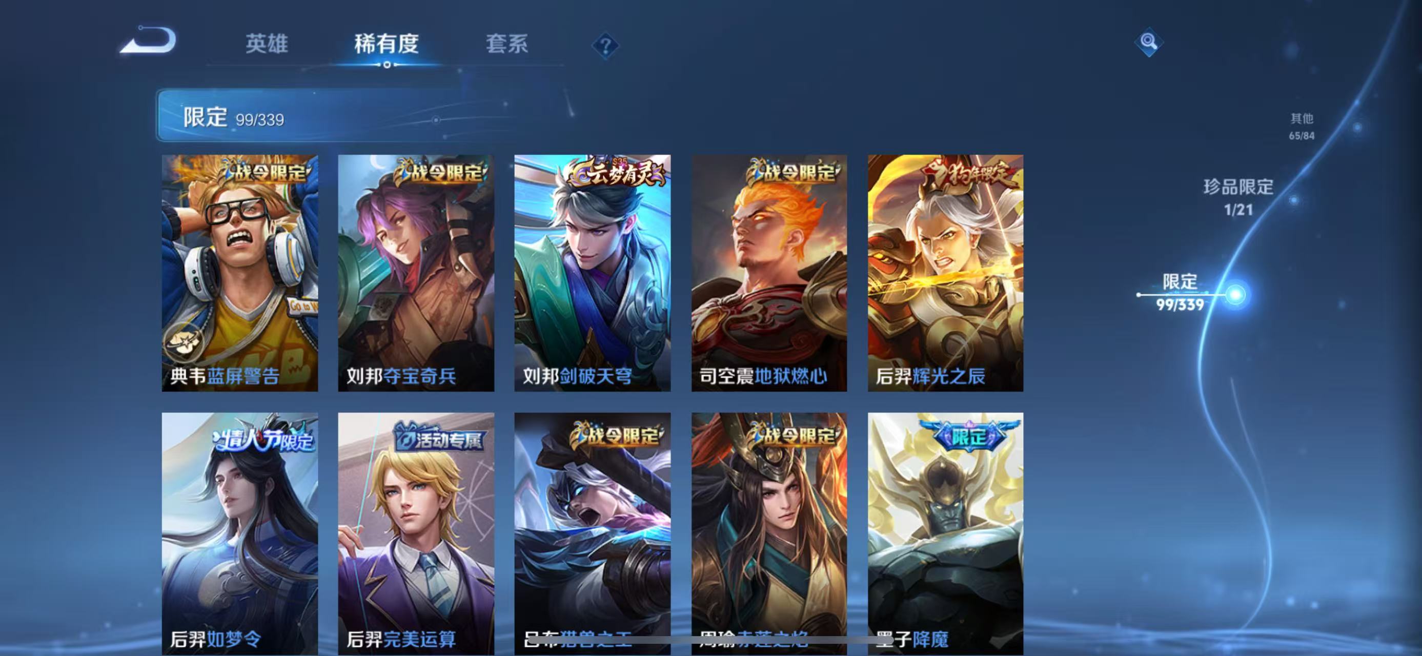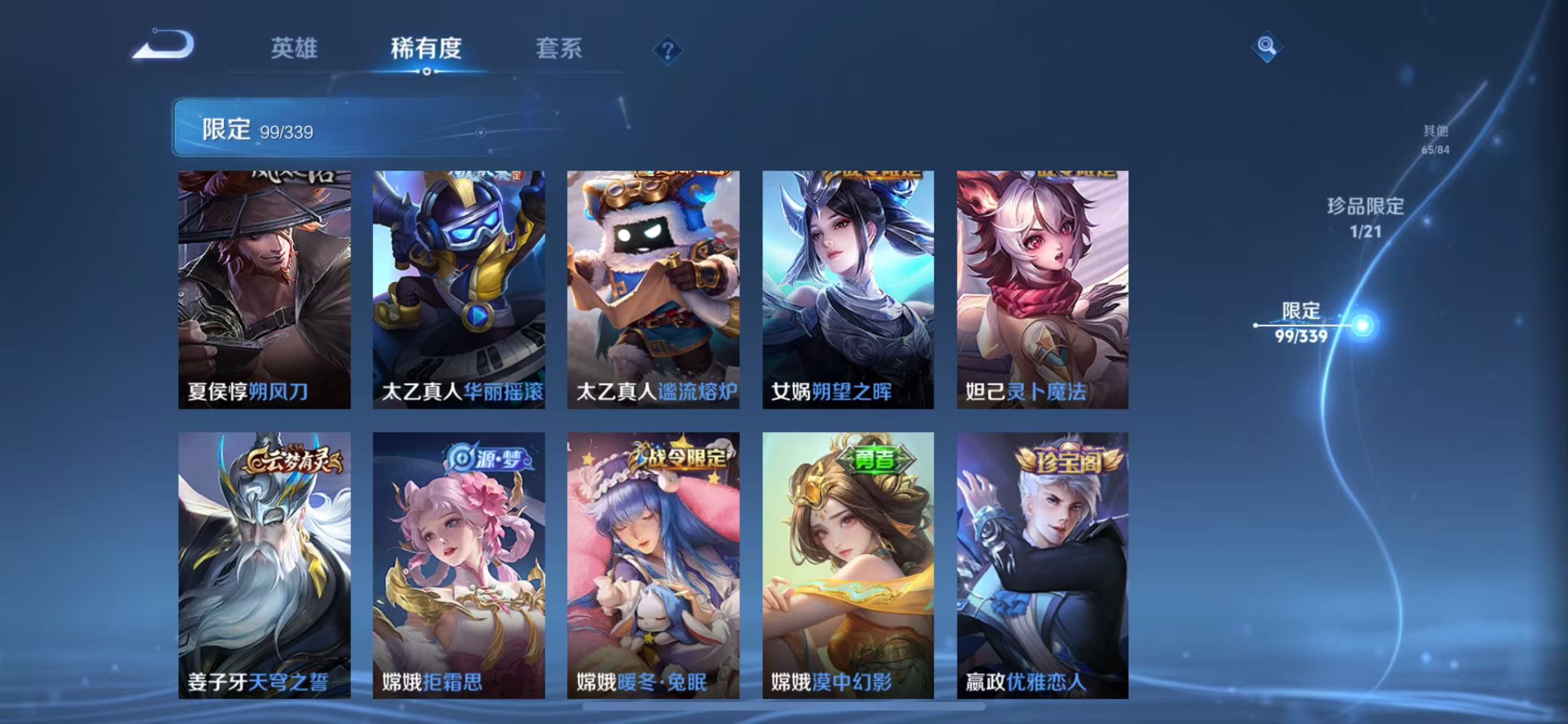 张良古海寻踪,桑启海盐诗旅,裴擒虎擒涛扼浪,鲁班大师探海日志,镜青焰无极,项羽苍威无极,米莱狄御霄,牛魔御旌,盾山御銮,夏侯惇朔风刀,弈星混沌棋,明世隐疑决卦,老夫子醍醐杖,鬼谷子原初探秘者,吕布猎兽之王,女娲朔望之晖,典韦蓝屏警告,沈梦溪星空之诺,李元芳银河之约,刘邦夺宝奇兵,马可波罗暗影游猎,蒙犽狂想玩偶喵,沈梦溪大漠名商,李元芳云中旅人