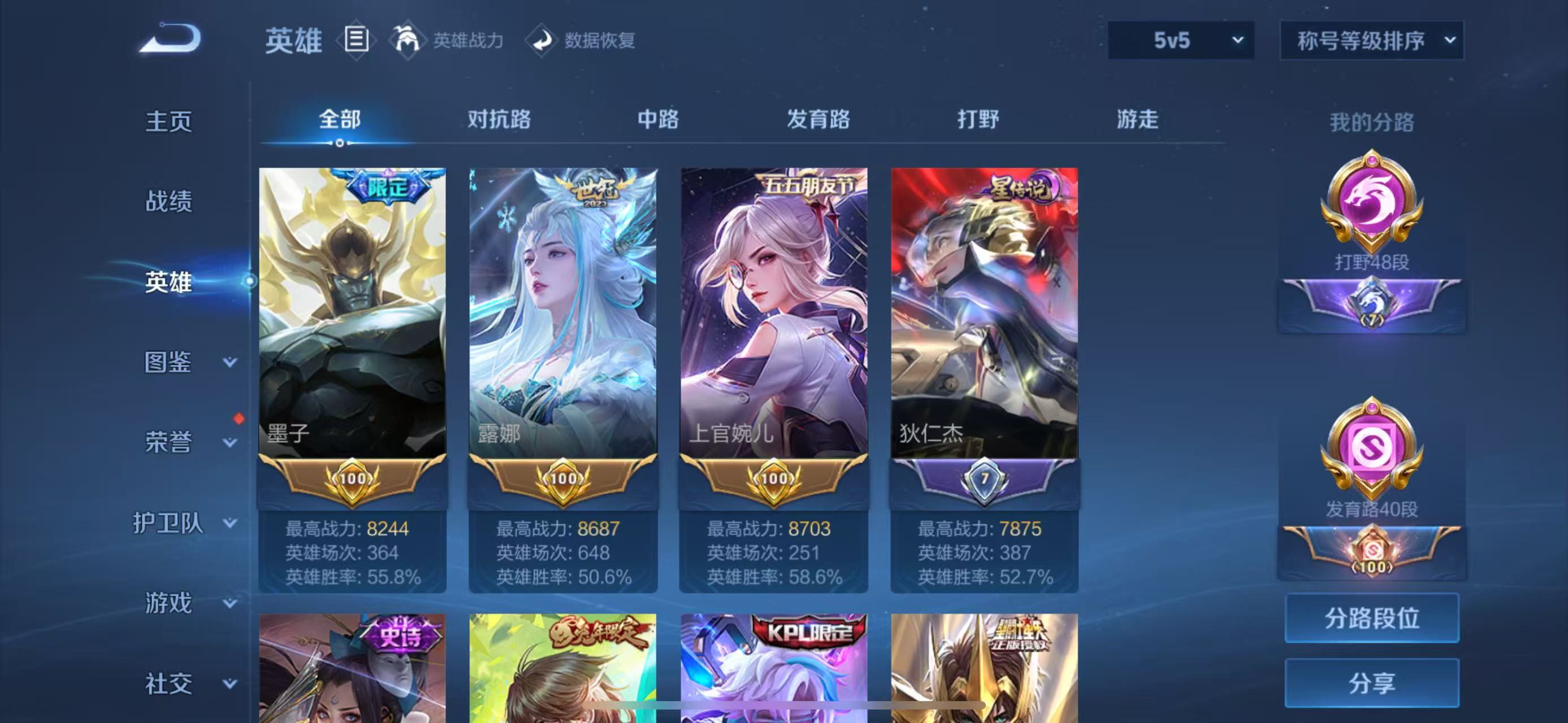 - [12265575]V7 1典藏 3传说 123英雄 145皮肤 可修改实名 女号 优质装备:弑枪猎影(韩信典藏),冠军飞将,久胜战神,超时空战士-狄仁杰 珍宝阁皮:玩趣恶龙 限定皮:凤凰于飞,遇见飞天,五谷丰年,逐梦之影,朱雀志(守约年限),乒乒小将,山海·玄木吟(马可年限) 史诗皮:蔬乡物语(鲁班七号),黄金分割率,千年之狐,冰冠公主,真我赫兹(百里守约),百解令(蒙犽),晚萤,偶像歌手,末日机甲-吕布,猫狗日记-孙策,猫狗日记-大乔,修罗,女仆咖啡,水果甜心,绅士熊喵,幽灵船长,鬼剑武藏,纤云弄巧,逐浪之夏,金属风暴,圣诞狂欢,圣诞恋歌,鹰眼统帅,魅力维加斯,无心