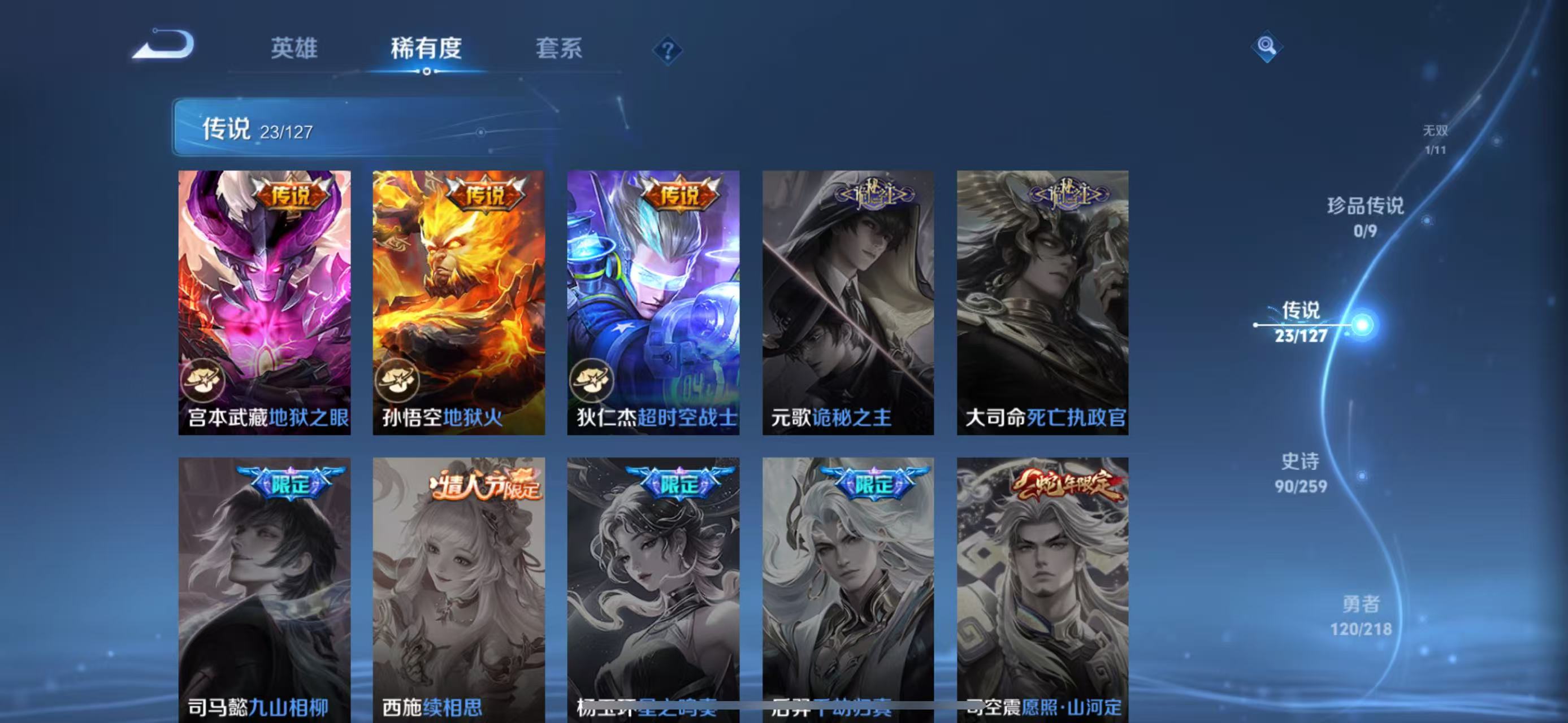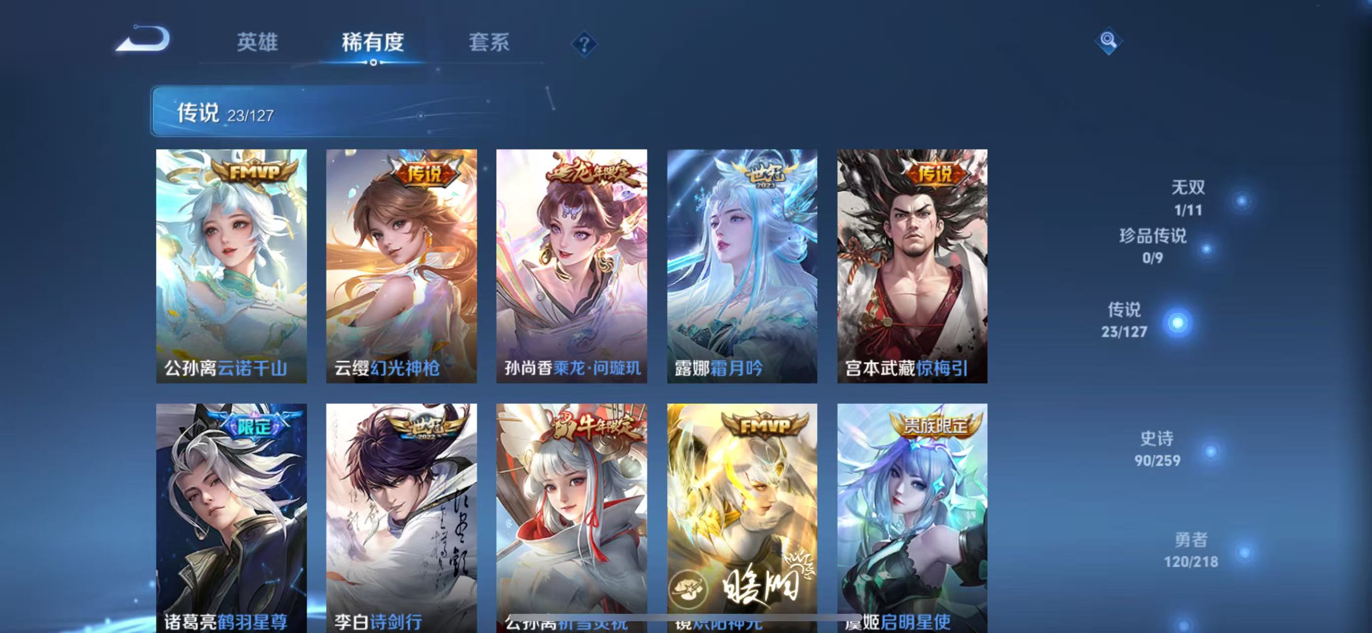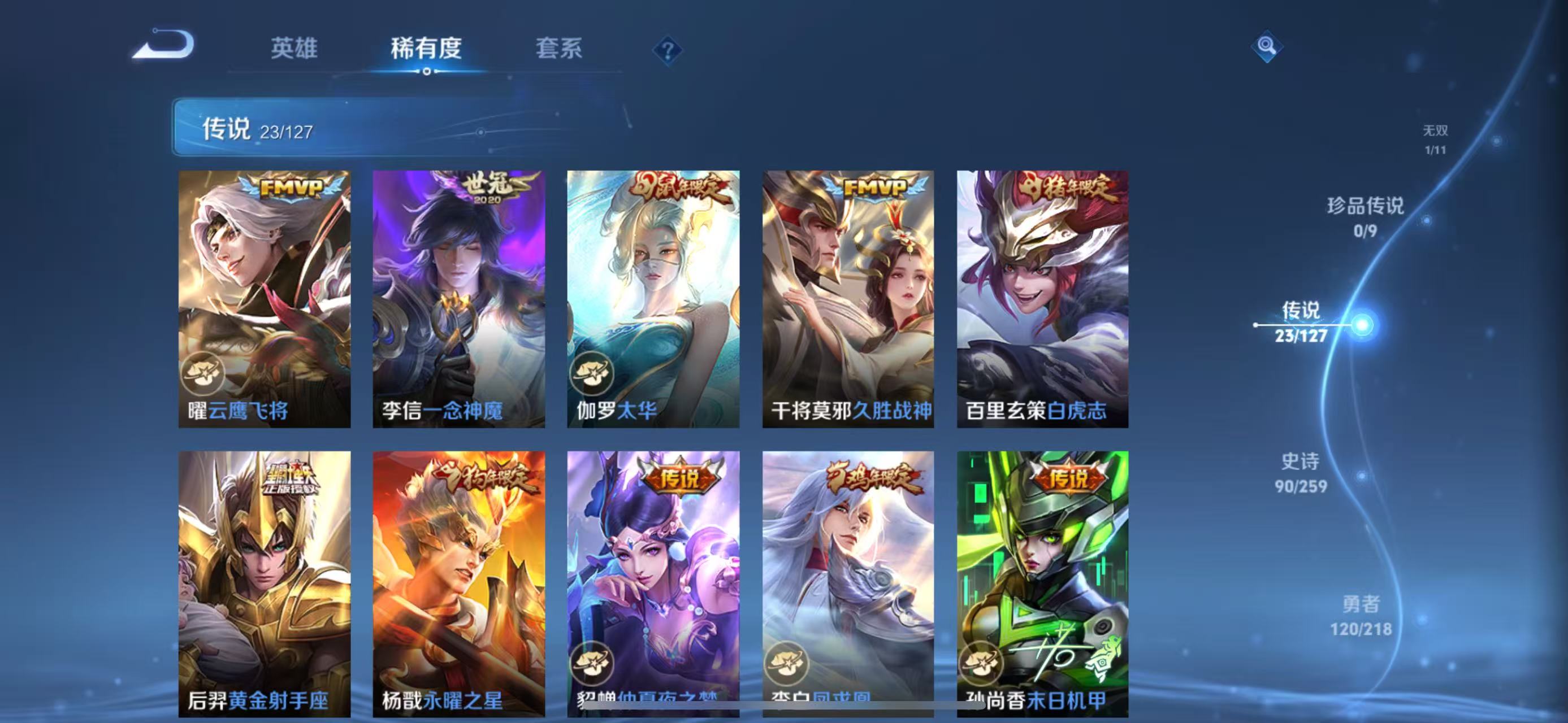孙悟空至尊宝,百里玄策白虎志,伽罗太华,马超神威,李白诗剑行,墨子降魔,上官婉儿梁祝,裴擒虎天狼狩猎者,公孙离祈雪灵祝,裴擒虎李小龙,百里守约朱雀志,后羿辉光之辰,后羿如梦令,马可波罗山海·玄木吟
