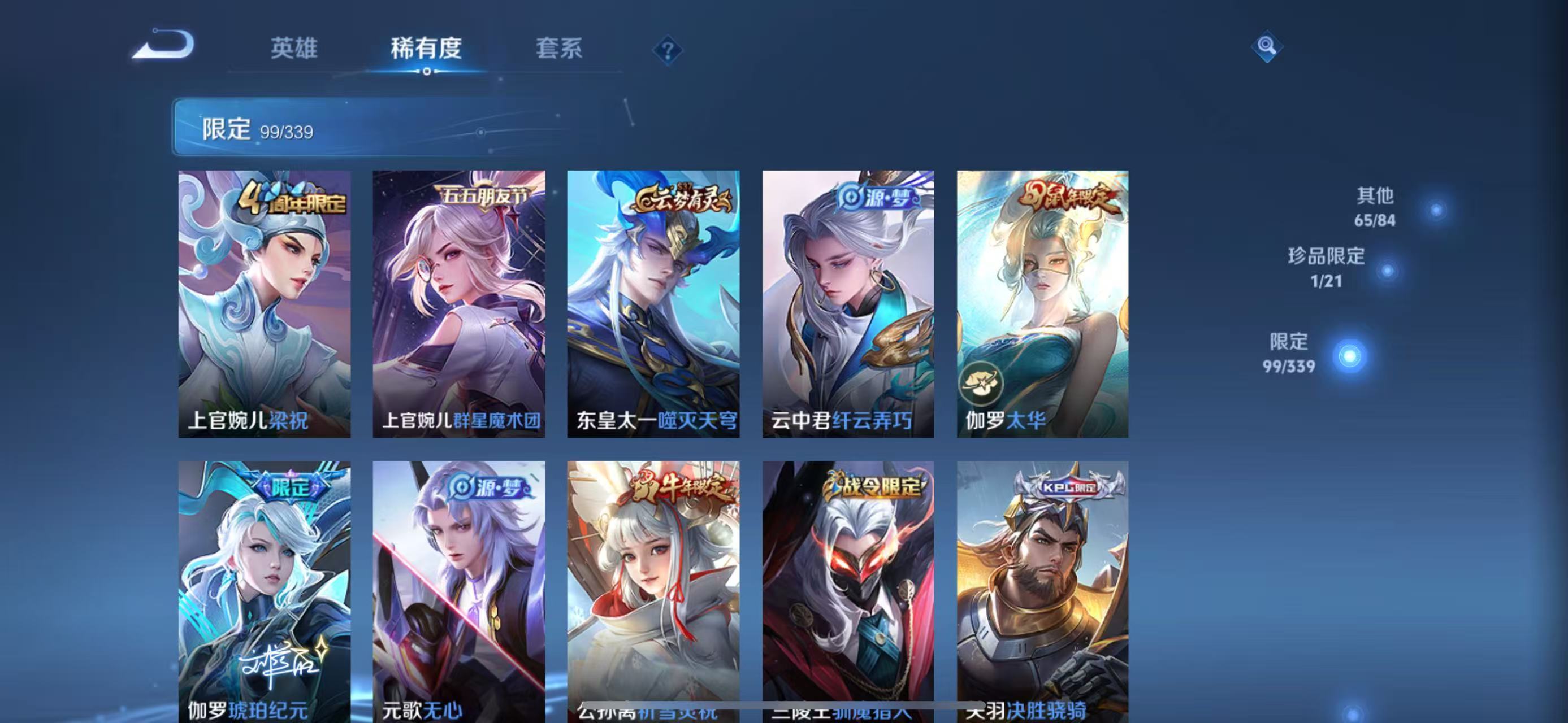 海诺心动手记,关羽决胜骁骑,上官婉儿群星魔术团,伽罗琥珀纪元,瑶遇见神鹿,露娜紫霞仙子,项羽苍穹之光,鲁班七号电玩小子,韩信白龙吟,刘禅电玩·爆裂旋风,赵怀真鹤归松栖,李元芳匿光侦查者,蒙犽百解令,高渐离燃音魔法,王昭君偶像歌手,墨子龙骑士,阿轲暗夜猫娘,不知火舞魅语,公孙离无限星赏官,娜可露露晚萤,大乔猫狗日记,阿轲节奏热浪,嬴政摇滚巨星,白起星夜王子,安琪拉心灵骇客,程咬金功夫厨神,刘邦德古拉伯爵,兰陵王暗隐猎兽者,曹操幽灵船长,宫本武藏鬼剑武藏,亚瑟心灵战警,钟馗乐园奇幻夜,蔡文姬舞动绿茵,西施诗语江南,嫦娥拒霜思,夏侯惇乘风破浪,李元芳逐浪之夏,铠曙光守护者,伽罗箭羽风息,墨子金属风暴,百里玄策原初追逐者,吕布圣诞狂欢,雅典娜黎明之约,澜赏金猎手