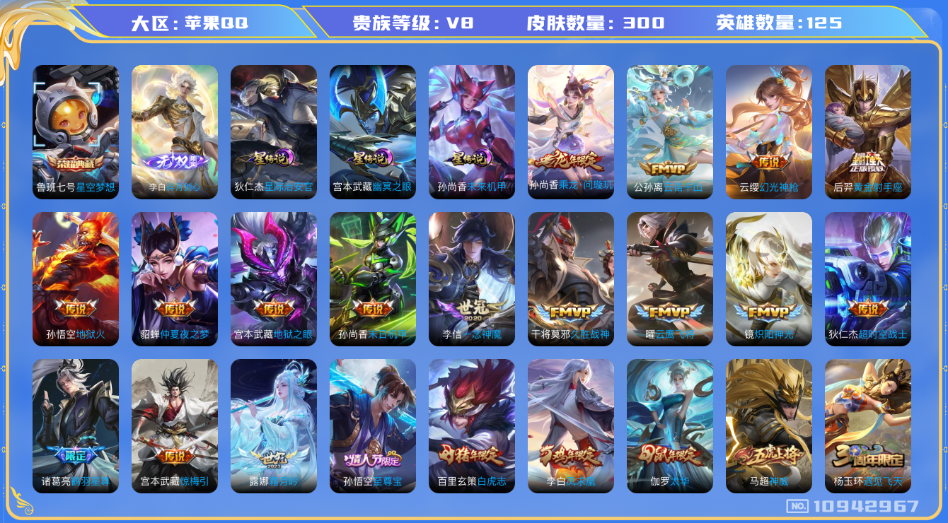 [10942967]王者荣耀-苹果QQ 金标孙悟空 宫本 云缨(万战) 孙尚香 墨子 露娜 上官婉儿 贵族8 荣耀典藏1 无双1 星元皮肤3 传说皮肤23 史诗皮肤89 皮肤数量300 皮肤价值:233772 英雄125 至尊星耀IV 总场次16142 【内测皮肤】1 嬴政_优雅恋人 【荣耀皮肤】1 鲁班七号_星空梦想【无双皮肤】1 李白_碎月剑心【星元皮肤】3 未来机甲 幽冥之眼 星际治安官 【传说皮肤】23 公孙离_云诺千山 云缨_幻光神枪 孙尚香_乘龙问璇玑 公孙离_祈雪灵祝 伽罗_太华 百里玄策_白虎志 杨戬_永曜之星 李白_凤求凰 虞姬_启明星使 宫本武藏_惊梅引 貂蝉_仲夏夜之梦 孙尚香_末日机甲 宫本武藏_地狱之眼 孙悟空_地狱火 狄仁杰_超时空战士 诸葛亮_鹤羽星尊 镜_炽阳神光 曜_云鹰飞将 干将莫邪_久胜战神 露娜_霜月吟 李白_诗剑行 李信_一念神魔 后羿_黄金射手座 【史诗皮肤】89 百里守约_雪豹霜爪 狂铁_龙之律动 阿轲_化蝶舞 孙膑_茶境仙 牛魔_星界战将 芈月_浮光幕影 黄忠_怒海争锋 镜_青焰无极 海诺_心动手记 上官婉儿_群星魔术团 狄仁杰_魔术师 赵云_皇家上将 马可波罗_山海玄木吟 百里守约_朱雀志 后羿_辉光之辰 后羿_如梦令 孙悟空_至尊宝 赵怀真_鹤归松栖 瑶_遇见神鹿 伽罗_箭羽风息 铠_曙光守护者 马超_神威 伽罗_琥珀纪元 墨子_降魔 阿古朵_江河有灵 鬼谷子_五谷丰年 裴擒虎_李小龙 上官婉儿_梁祝 杨玉环_遇见飞天 鲁班七号_蔬乡物语 高渐离_燃音魔法 司空震_地狱燃心 暃_星界游侠 蒙犽_狂想玩偶喵 马可波罗_暗影游猎 阿轲_迷踪丽影 李元芳_银河之约 兰陵王_驯魔猎人 典韦_蓝屏警告 李元芳_匿光侦查者 裴擒虎_天狼狩猎者 刘禅_电玩爆裂旋风 澜_赏金猎手 钟馗_乐园奇幻夜 西施_诗语江南 不知火舞_魅语 娜可露露_晚萤 公孙离_无限星赏官 大乔_猫狗日记 阿轲_节奏热浪 白起_星夜王子 程咬金_功夫厨神 李元芳_逐浪之夏 蔡文姬_舞动绿茵 安琪拉_心灵骇客 亚瑟_心灵战警 兰陵王_暗隐猎兽者 夏侯惇_乘风破浪 刘邦_德古拉伯爵 韩信_白龙吟 曹操_幽灵船长 阿轲_暗夜猫娘 妲己_女仆咖啡 妲己_魅力维加斯 宫本武藏_鬼剑武藏 露娜_紫霞仙子 鲁班七号_电玩小子 吕布_圣诞狂欢 墨子_金属风暴 墨子_龙骑士 孙尚香_水果甜心 王昭君_偶像歌手 项羽_苍穹之光 嬴政_摇滚巨星 赵云_未来纪元 甄姬_冰雪圆舞曲 蒙犽_百解令 元歌_无心 嫦娥_拒霜思 云中君_纤云弄巧 蔡文姬_繁星吟游 蒙恬_荣光圣徽 梦奇_顽趣 雅典娜_黎明之约 百里玄策_原初追逐者 张飞_乱世虎臣 钟无艳_王者之锤 狄仁杰_鹰眼统帅