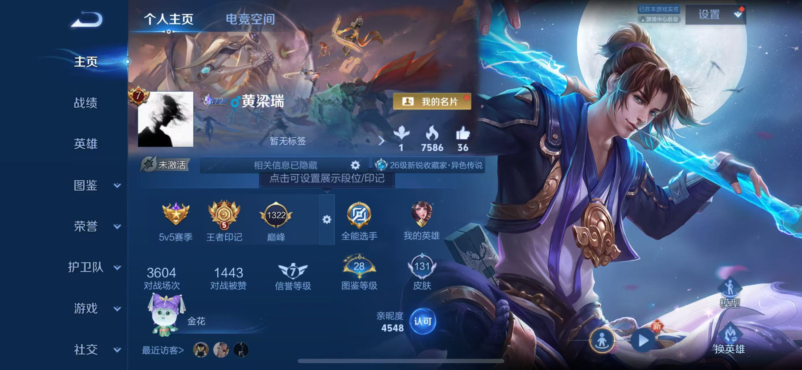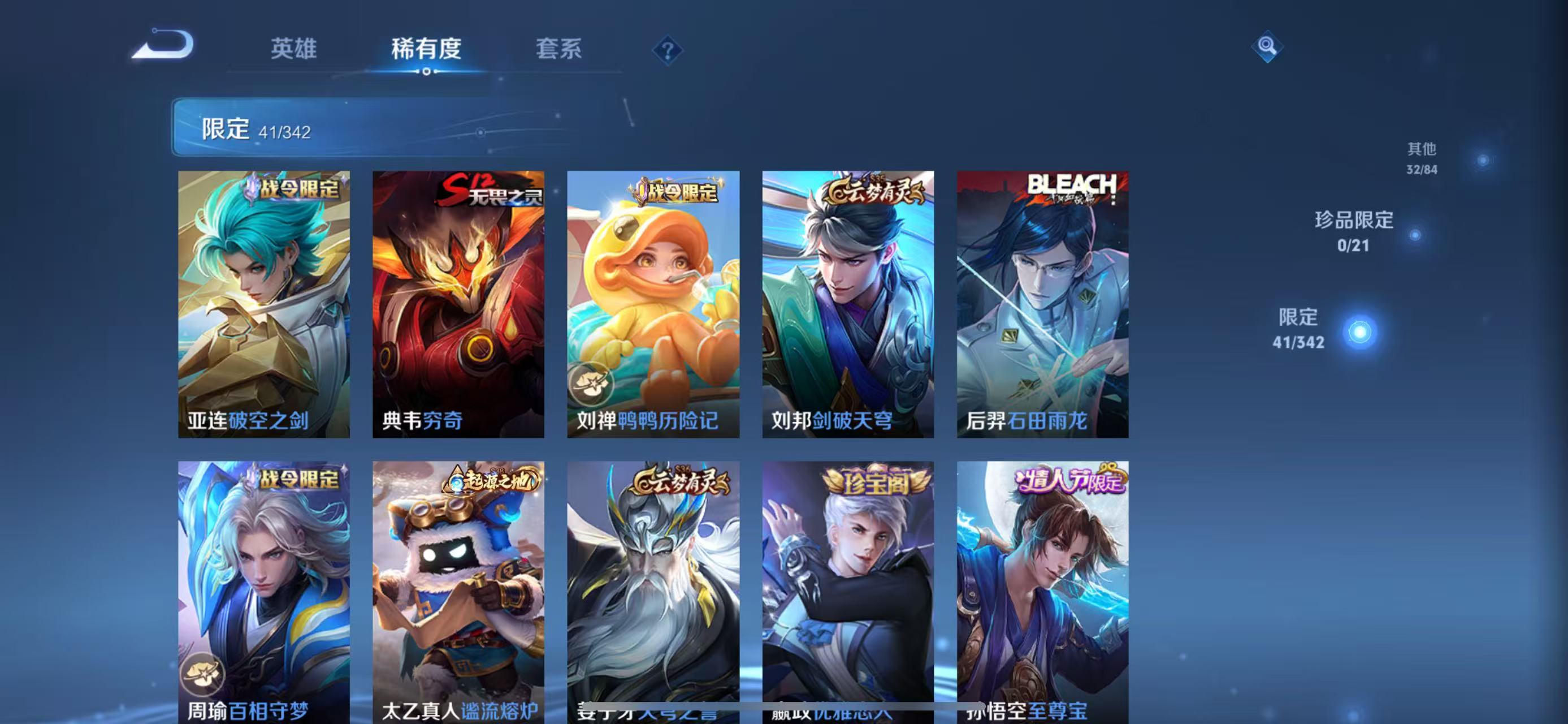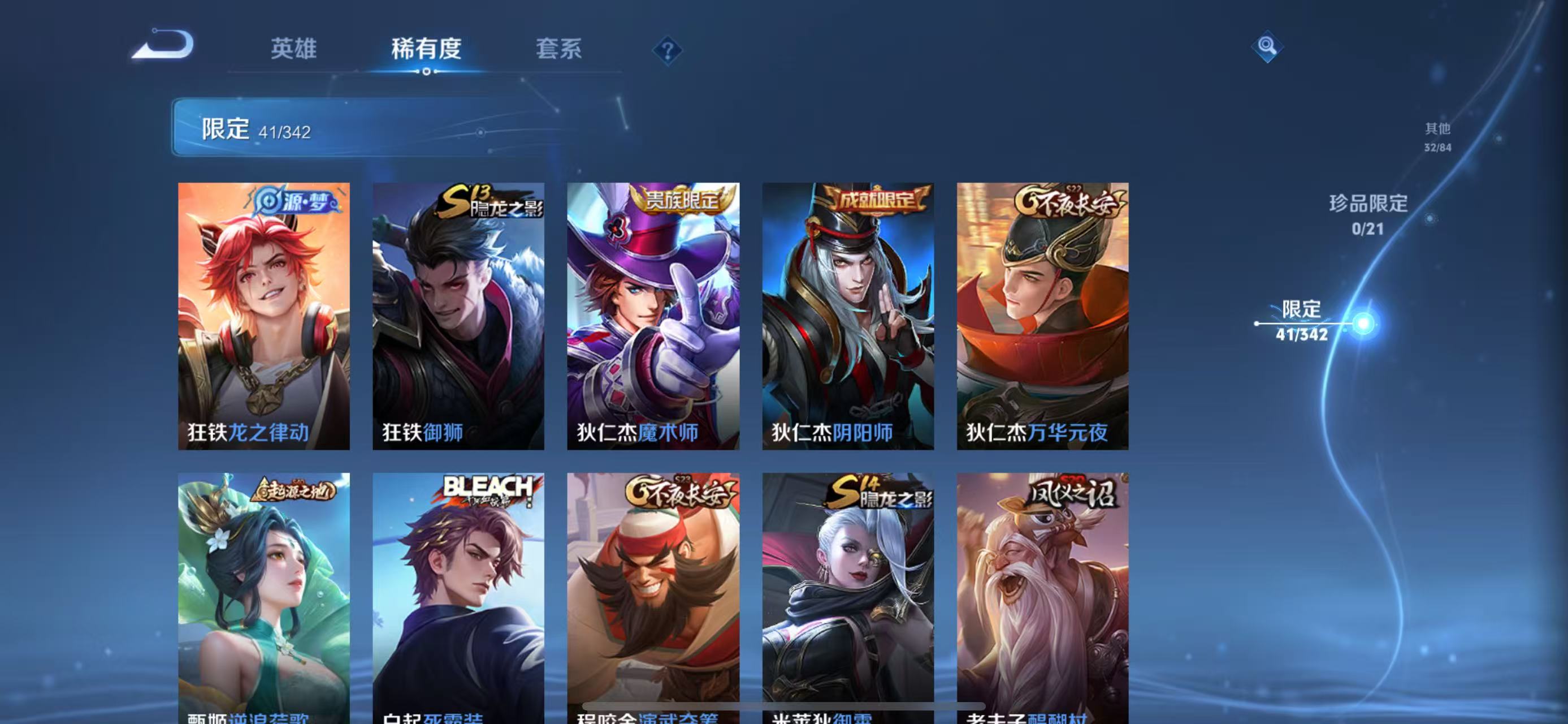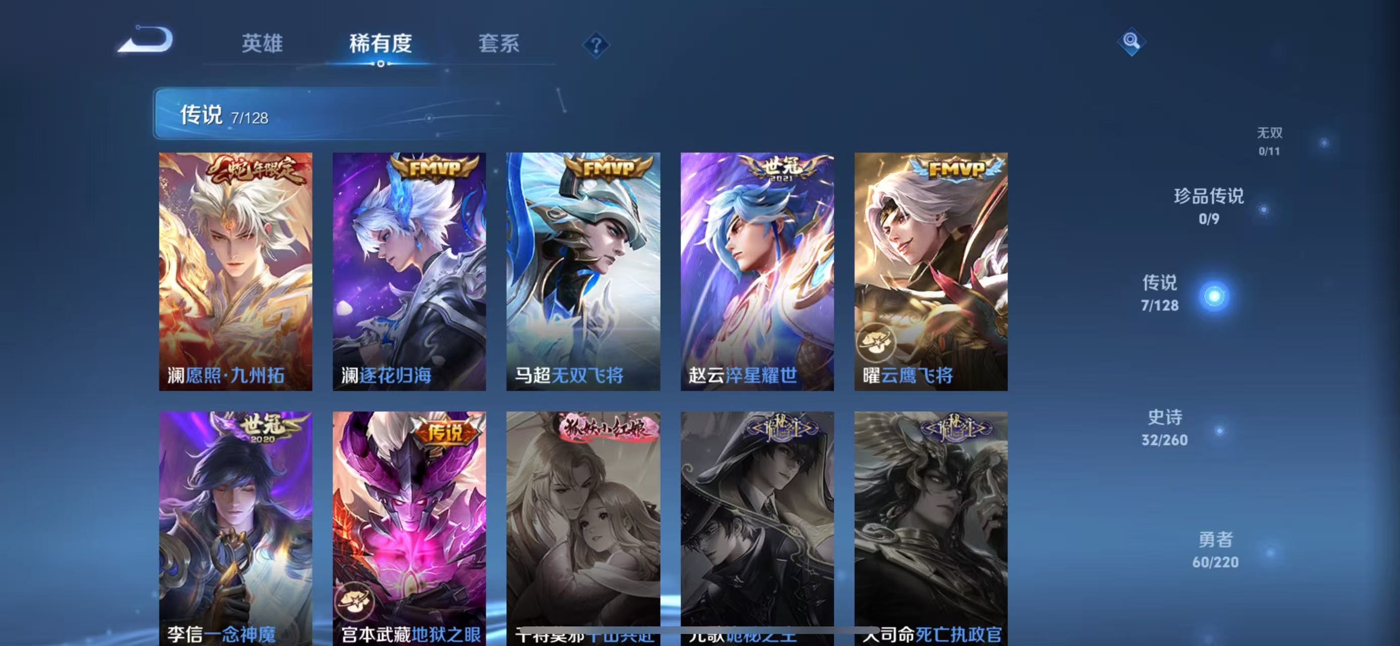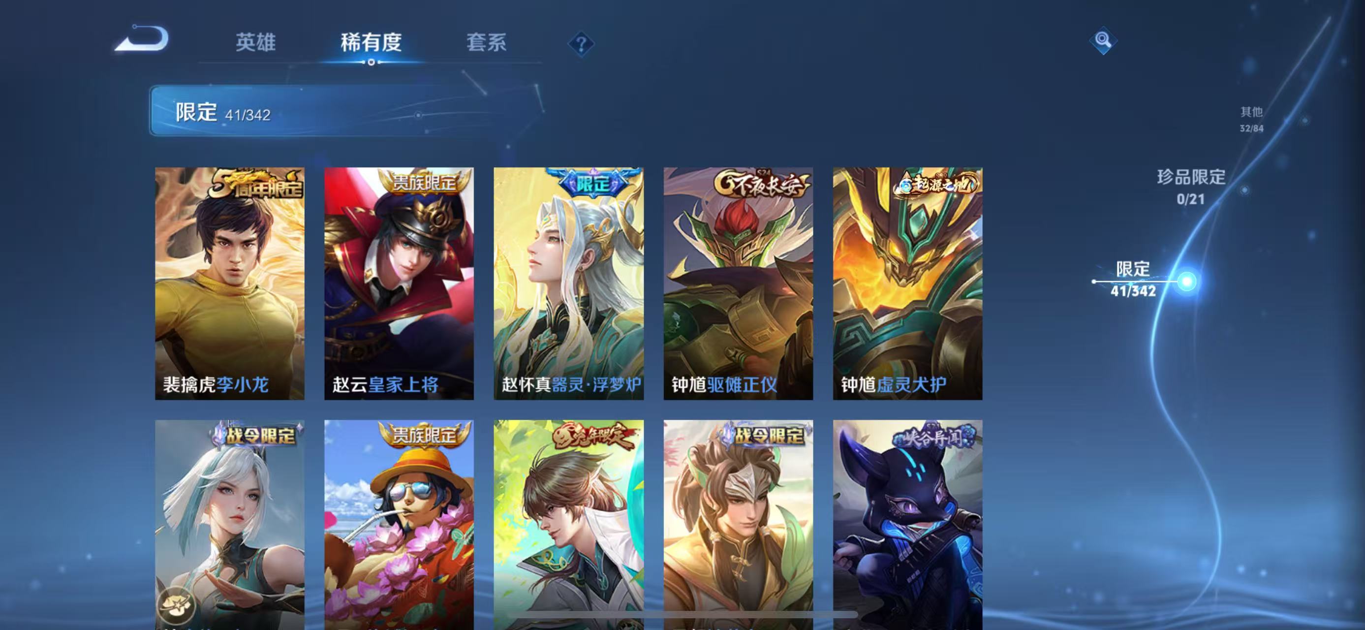 - PX_2089806-贵族等级: V7 英雄数: 98 皮肤数: 104 传说皮: 黄金射手座,地狱火 限定皮: 李小龙,梁祝,天狼征服者,凤求凰