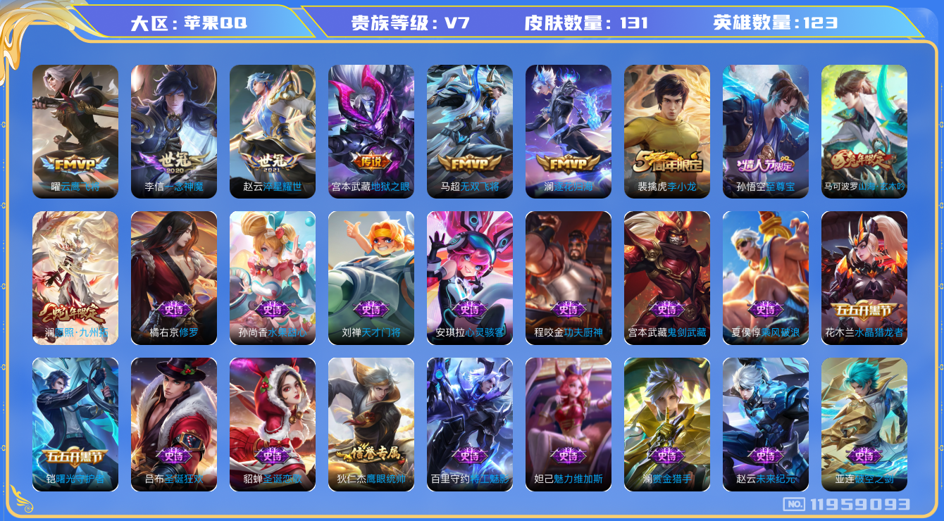 [11959093]王者荣耀-苹果QQ 贵族7 传说皮肤7 史诗皮肤32 皮肤数量131 皮肤价值:79820 英雄123 【内测皮肤】1/嬴政_优雅恋人【传说皮肤】7/澜_愿照九州拓/宫本武藏_地狱之眼/澜_逐花归海/马超_无双飞将/曜_云鹰飞将/赵云_淬星耀世/李信_一念神魔/ 【史诗皮肤】32/镜_青焰无极/黄忠_百相守梦/周瑜_百相守梦/后羿_石田雨龙/狂铁_龙之律动/孙膑_茶境仙/赵怀真_器灵浮梦炉/亚连_破空之剑/牛魔_星界战将/刘禅_鸭鸭历险记/狄仁杰_魔术师/赵云_皇家上将/马可波罗_山海玄木吟/孙悟空_至尊宝/铠_曙光守护者/花木兰_水晶猎龙者/裴擒虎_李小龙/澜_赏金猎手/橘右京_修罗/程咬金_功夫厨神/刘禅_天才门将/百里守约_特工魅影/安琪拉_心灵骇客/夏侯惇_乘风破浪/妲己_魅力维加斯/貂蝉_圣诞恋歌/宫本武藏_鬼剑武藏/吕布_圣诞狂欢/孙尚香_水果甜心/赵云_未来纪元/狄仁杰_鹰眼统帅/ 【其他皮肤】92/莱西奥_踏浪烽翎/高渐离_落日弦歌/孙策_百相守梦/甄姬_逆浪荇歌/白起_死霸装/马超_访茗客/刘备_浪漫序章/戈娅_玫蓝誓约/太乙真人_谧流熔炉/达摩_爆裂喵拳/东皇太一_金福满堂/姜子牙_天穹之誓/孙悟空_神迹守卫/程咬金_群星魔术团/刘邦_剑破天穹/铠_龙域领主/钟馗_虚灵犬护/露娜_命运加冕/沈梦溪_鸭鸭历险记/项羽_海滩派对/鬼谷子_天穹祈灯/张良_古海寻踪/钟馗_驱傩正仪/程咬金_演武夺筹/狄仁杰_万华元夜/鬼谷子_原初探秘者/老夫子_醍醐杖/明世隐_疑决卦/弈星_混沌棋/米莱狄_御霄/狂铁_御狮/典韦_穷奇/曹操_烛龙/鲁班大师_乓乓大师/张良_缤纷绘卷/盾山_圆桌骑士/宫本武藏_万象初新/猪八戒_潮玩探月行/戈娅_危途狂花/马可波罗_潮玩牛仔/杨戬_次元傲视/刘禅_秘密基地/吕布_野性能量/小乔_丁香结/狂铁_命运角斗场/王昭君_幻想奇妙夜/钟无艳_海滩丽影/花木兰_兔女郎/安琪拉_玩偶对对碰/典韦_黄金武士/韩信_街头霸王/韩信_教廷特使/赵云_忍炎影/妲己_少女阿狸/亚瑟_死亡骑士/苏烈_坚韧之力/李白_敏锐之力/诸葛亮_掌控之力/宫本武藏_霸王丸/狄仁杰_阴阳师/刘备_汉昭烈帝/金蝉_前尘/云缨_赤焰之缨/澜_孤猎/马超_幸存者/曜_归虚梦演/云中君_荷鲁斯之眼/盘古_创世神祝/猪八戒_年年有余/李信_灼热之刃/司马懿_魇语军师/孙策_海之征途/米莱狄_精准探案法/明世隐_占星师/百里玄策_威尼斯狂欢/百里守约_绝影神枪/黄忠_芝加哥教父/杨戬_埃及法老/马可波罗_激情绿茵/夏侯惇_战争骑士/李元芳_特种部队/钟馗_地府判官/李白_范海辛/兰陵王_隐刃/曹操_超能战警/狄仁杰_锦衣卫/后羿_精灵王/花木兰_剑舞者/老夫子_潮流仙人/鲁班七号_木偶奇遇记/孙悟空_西部大镖客/小乔_万圣前夜