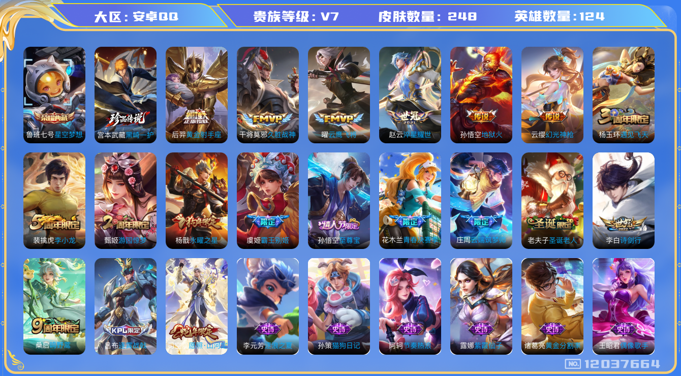 [12037664]【暑期末清货/特价急出/永久包赔】:安卓Q-V7-永恒钻石I段位-124英雄-248皮肤-1典藏-1珍品传说-10传说-60史诗