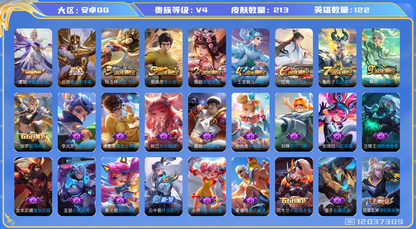 [12037309]【暑期末清货/特价急出/永久包赔】:安卓Q-V4-最强王者段位-122英雄-213皮肤-1典藏-2传说-42史诗【荣耀典藏】:虞姬神鉴启示录【传说皮肤】:后羿黄金射手座,桑启鸣野蒿【史诗皮肤】:妲己魅力维加斯,妲己女仆咖啡,小乔缤纷独角兽,赵云未来纪元,墨子金属风暴,嬴政摇滚巨星,孙尚香水果甜心,孙尚香蔷薇恋人,庄周高山流水,刘禅天才门将,刘禅电玩爆裂旋风,吕布圣诞狂欢,元歌云间偶戏,元歌无心,夏侯惇乘风破浪,甄姬冰雪圆舞曲,甄姬游园惊梦,宫本武藏鬼剑武藏,狄仁杰鹰眼统帅,貂蝉圣诞恋歌,安琪拉心灵骇客,兰陵王暗隐猎兽者,花木兰水晶猎龙者,亚瑟心灵战警,李元芳逐浪之夏,李元芳银河之约,杨玉环遇见飞天,雅典娜黎明之约,蔡文姬舞动绿茵,鬼谷子五谷丰年,诸葛亮黄金分割率,百里玄策原初追逐者,梦奇顽趣,裴擒虎李小龙,云中君纤云弄巧,伽罗箭羽风息,上官婉儿梁祝,嫦娥拒霜思,阿古朵江河有灵,蒙恬荣光圣徽