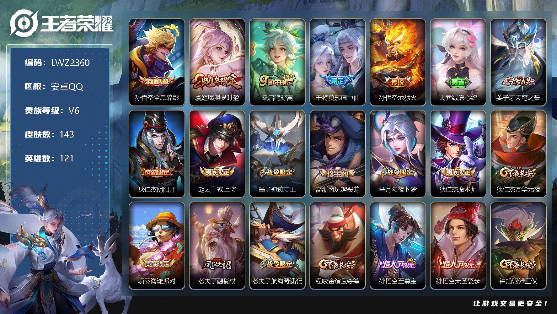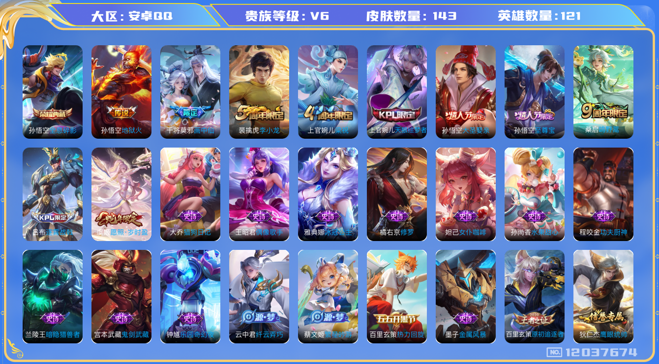 [12037674]【特价急出/详情看图】:安卓Q-V6-至尊星耀IV段位-121英雄-143皮肤-1典藏-4传说-33史诗