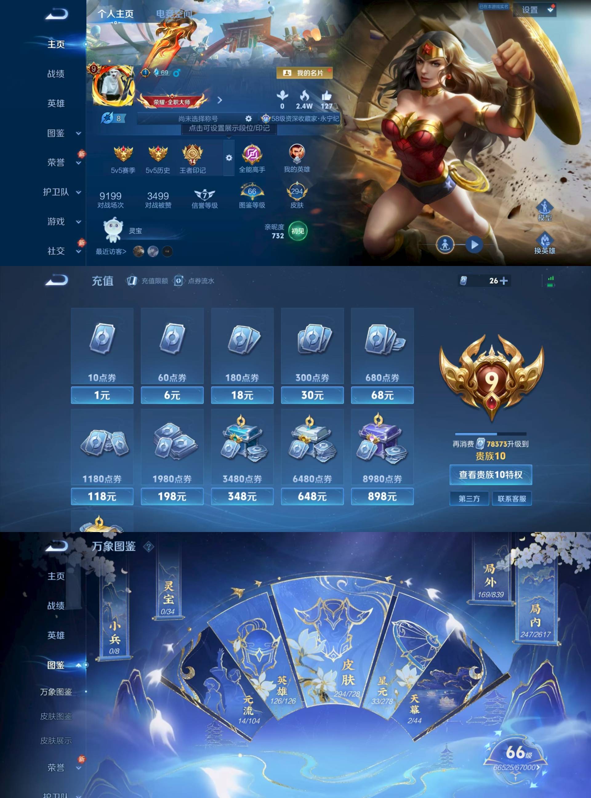 - [11912698]V10 4典藏 19传说 126英雄 335皮肤 典藏英雄武则天 可修改实名 优质装备:天鹅之梦(小乔典藏),星空梦想(太空人),杀手不太冷,全息碎影(猴子典藏),黄金射手座,久胜战神,云霓雀翎,末日机甲-孙尚香(绿蚂蚱),地狱火,仲夏夜之梦(大飞蛾),海洋之心,地狱之眼,胖达荣荣,李逍遥,游龙清影(小青龙),超时空战士-狄仁杰,电玩·雷克斯,鹤羽星尊,艾琳觅芳踪,涂山容容 传说皮:幻光神枪 珍宝阁皮:优雅恋人,女武神 限定皮:愿照·千秋盛(女娲年限),逐霄战戟,陌上桑,鸣野蒿,至尊宝,飞衡(韩信年限),遇见飞天,高山流水,梁祝,天狼狩猎者,李小龙,如梦令-后羿,霸王别姬-项羽,引擎之心,青春决赛季,蜜橘之夏 史诗皮:化蝶舞,灵蛊蚀心,谪仙醉月,龙之律动,石田雨龙,茶境仙,破空之剑,百相守梦-百里守约,织梦人,紫霞仙子,苍穹之光,电玩小子(小书包),白龙吟,黄金分割率,特工魅影,千年之狐,匿光破解者,冰冠公主,偶像歌手,白蛇,暗夜猫娘,龙骑士(小龙虾),末日机甲-吕布,猫狗日记-孙策,猫狗日记-大乔,乱世虎臣,节奏热浪,女仆咖啡,摇滚巨星,水果甜心,绅士熊喵,天才门将,星夜王子,心灵骇客,功夫厨神,德古拉伯爵,暗隐猎兽者,幽灵船长,鬼剑武藏,心灵战警,乐园奇幻夜,天秀·启明,舞动绿茵,地狱岩魂,诗语江南,纤云弄巧,繁星吟游(呼啦呼啦),缤纷独角兽,乘风破浪,逐浪之夏,月团寄思,水晶猎龙者,曙光守护者,箭羽风息,金属风暴,原初追逐者,圣诞狂欢,圣诞恋歌,鹰眼统帅,暗夜贵公子,魅力维加斯,黎明之约,未来纪元-赵云