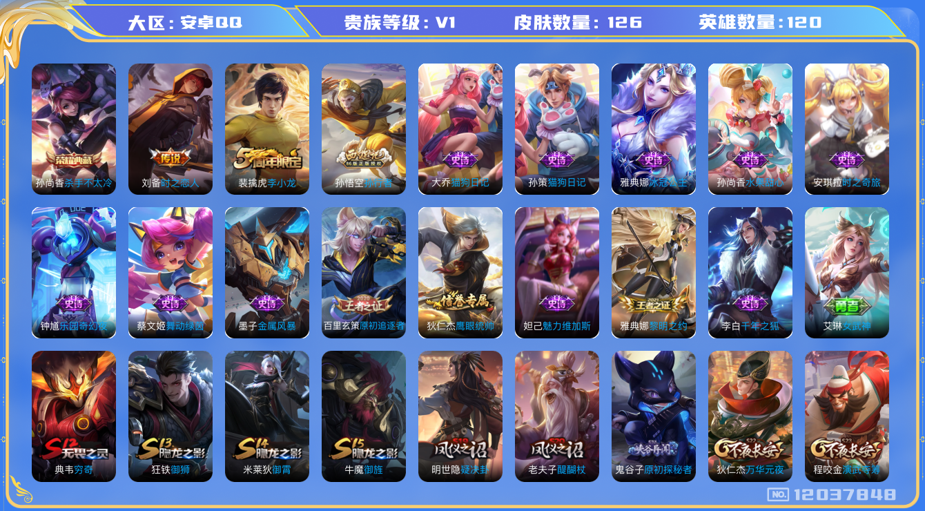 [12037848]【暑期末清货/特价急出/永久包赔】:安卓Q-V0-至尊星耀I段位-120英雄-126皮肤-1典藏-1传说-18史诗