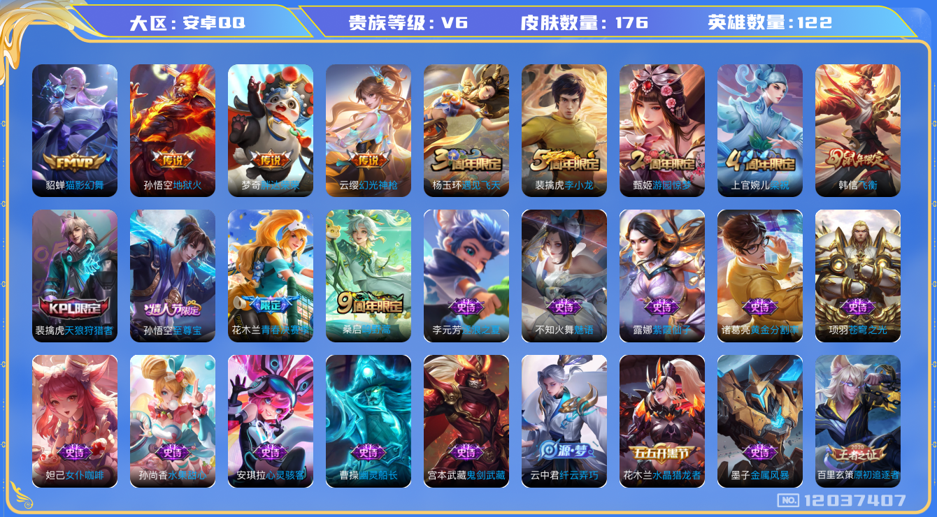 [12037407]【暑期末清货/特价急出/永久包赔】:安卓Q-V6-最强王者段位-122英雄-176皮肤-5传说-35史诗【传说皮肤】:孙悟空地狱火,梦奇胖达荣荣,貂蝉猫影幻舞,桑启鸣野蒿,云缨幻光神枪【年限皮肤】:韩信飞衡【史诗皮肤】:项羽苍穹之光,露娜紫霞仙子,赵云皇家上将,赵云未来纪元,甄姬冰雪圆舞曲,狄仁杰魔术师,宫本武藏鬼剑武藏,孙尚香水果甜心,妲己魅力维加斯,妲己女仆咖啡,墨子金属风暴,吕布圣诞狂欢,曹操幽灵船长,孙悟空至尊宝,花木兰水晶猎龙者,诸葛亮黄金分割率,甄姬游园惊梦,安琪拉心灵骇客,花木兰青春决赛季,李元芳逐浪之夏,杨玉环遇见飞天,裴擒虎天狼狩猎者,狄仁杰鹰眼统帅,上官婉儿梁祝,韩信飞衡,不知火舞魅语,马可波罗暗影游猎,百里玄策原初追逐者,裴擒虎李小龙,云中君纤云弄巧,嫦娥拒霜思,蒙犽百解令,黄忠怒海争锋,阿轲化蝶舞,扁鹊灵蛊蚀心