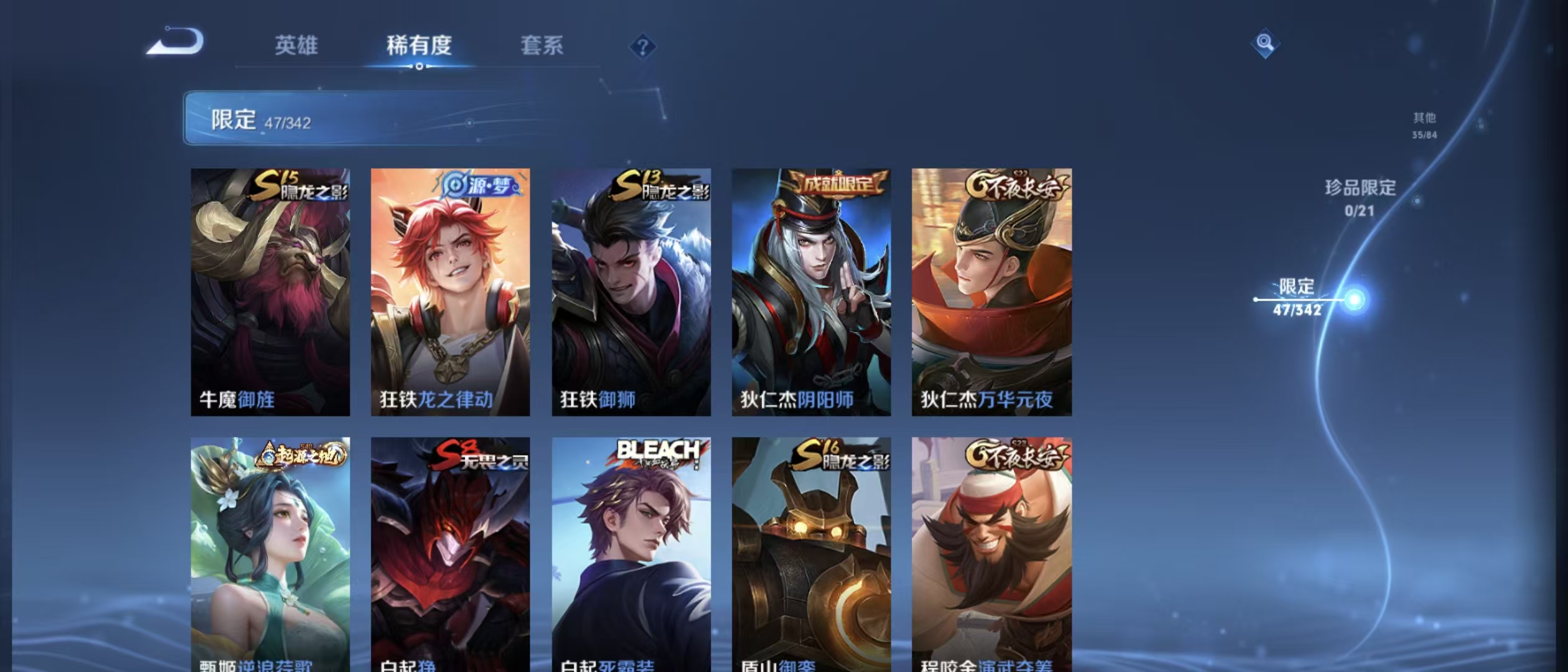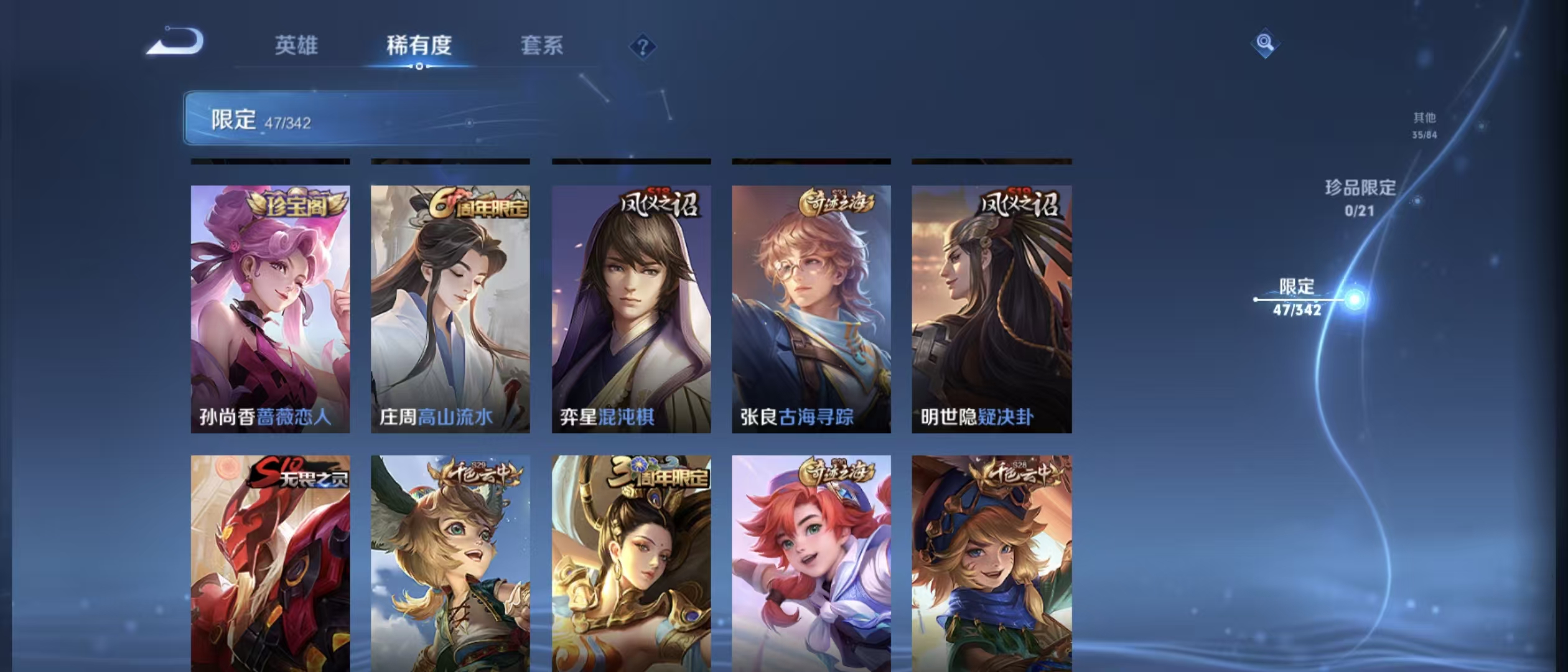 白起狰,太乙真人饕餮,曹操烛龙,芈月重明,典韦穷奇,狂铁御狮,米莱狄御霄,牛魔御旌,盾山御銮,夏侯惇朔风刀,明世隐疑决卦,老夫子醍醐杖,鬼谷子原初探秘者,狄仁杰万华元夜,程咬金演武夺筹,钟馗驱傩正仪,苏烈千军破阵,弈星混沌棋,达摩沙漠行僧,兰陵王金庭之子,沈梦溪大漠名商,李元芳云中旅人,桑启海盐诗旅,裴擒虎擒涛扼浪,鲁班大师探海日志,张良古海寻踪