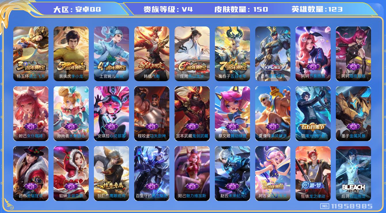 [11958985]王者荣耀-安卓QQ 贵族4 史诗皮肤29 皮肤数量150 皮肤价值:83392 英雄123 【内测皮肤】2/高渐离_玩趣恶龙/孙尚香_蔷薇恋人【史诗皮肤】29/黄忠_百相守梦/后羿_石田雨龙/狂铁_龙之律动/韩信_飞衡/铠_曙光守护者/阿古朵_江河有灵/鬼谷子_五谷丰年/庄周_高山流水/裴擒虎_李小龙/上官婉儿_梁祝/杨玉环_遇见飞天/阿轲_节奏热浪/程咬金_功夫厨神/蔡文姬_舞动绿茵/百里守约_特工魅影/安琪拉_心灵骇客/夏侯惇_乘风破浪/阿轲_暗夜猫娘/妲己_女仆咖啡/妲己_魅力维加斯/貂蝉_圣诞恋歌/宫本武藏_鬼剑武藏/吕布_圣诞狂欢/墨子_金属风暴/孙尚香_水果甜心/赵云_未来纪元/甄姬_冰雪圆舞曲/狄仁杰_鹰眼统帅/ 【其他皮肤】120/莱西奥_踏浪烽翎/庄周_锦麟游梦/姜子牙_星梦巡礼/甄姬_逆浪荇歌/白起_死霸装/姬小满_小满鸭/钟馗_虚灵犬护/露娜_命运加冕/苍_苍林狼骑/东皇太一_噬灭天穹/吕布_逐霄战戟/程咬金_无双福将/铠_龙域领主/项羽_海滩派对/鬼谷子_天穹祈灯/张良_古海寻踪/鲁班大师_探海日志/裴擒虎_擒涛扼浪/桑启_海盐诗旅/沈梦溪_大漠名商/兰陵王_金庭之子/李元芳_云中旅人/达摩_沙漠行僧/苏烈_千军破阵/钟馗_驱傩正仪/程咬金_演武夺筹/狄仁杰_万华元夜/鬼谷子_原初探秘者/老夫子_醍醐杖/明世隐_疑决卦/弈星_混沌棋/夏侯惇_朔风刀/盾山_御銮/牛魔_御旌/米莱狄_御霄/狂铁_御狮/典韦_穷奇/芈月_重明/曹操_烛龙/太乙真人_饕餮/白起_狰/后羿_完美运算/李元芳_妄想特派/刘禅_唤灵魔甲/鲁班大师_乓乓大师/狂铁_特工战影/盾山_圆桌骑士/刘备_纽约教父/扁鹊_化身博士/关羽_龙腾万里/宫本武藏_万象初新/刘备_万事如意/甄姬_花好人间/廉颇_功夫炙烤/猪八戒_潮玩探月行/露娜_瓷语鉴心/刘禅_秘密基地/哪吒_次元突破/吕布_野性能量/明世隐_虹云星官/鬼谷子_幻乐之宴/老夫子_功夫老勺/王昭君_幻想奇妙夜/钟无艳_海滩丽影/后羿_阿尔法小队/花木兰_兔女郎/阿轲_爱心护理/安琪拉_玩偶对对碰/白起_白色死神/扁鹊_救世之瞳/程咬金_星际陆战队/达摩_大发明家/典韦_黄金武士/宫本武藏_未来纪元/韩信_街头霸王/韩信_教廷特使/孙膑_天使之翼/武则天_东方不败/赵云_忍炎影/妲己_少女阿狸/露娜_哥特玫瑰/亚瑟_死亡骑士/诸葛亮_掌控之力/孙尚香_沉稳之力/宫本武藏_霸王丸/狄仁杰_阴阳师/暃_碧珀绯影/金蝉_前尘/云缨_赤焰之缨/曜_归虚梦演/瑶_森/猪八戒_年年有余/上官婉儿_修竹墨客/李信_灼热之刃/伽罗_花见巫女/司马懿_魇语军师/孙策_海之征途/裴擒虎_街头旋风/杨玉环_霓裳曲/百里守约_绝影神枪/鬼谷子_阿摩司公爵/干将莫邪_第七人偶/诸葛亮_星航指挥官/杨戬_埃及法老/雅典娜_战争女神/夏侯惇_战争骑士/虞姬_加勒比小姐/李元芳_特种部队/钟馗_地府判官/李白_范海辛/狄仁杰_锦衣卫/貂蝉_异域舞娘/后羿_精灵王/老夫子_潮流仙人/刘禅_英喵野望/鲁班七号_木偶奇遇记/鲁班七号_福禄兄弟/孙悟空_西部大镖客/王昭君_精灵公主/钟无艳_生化警戒