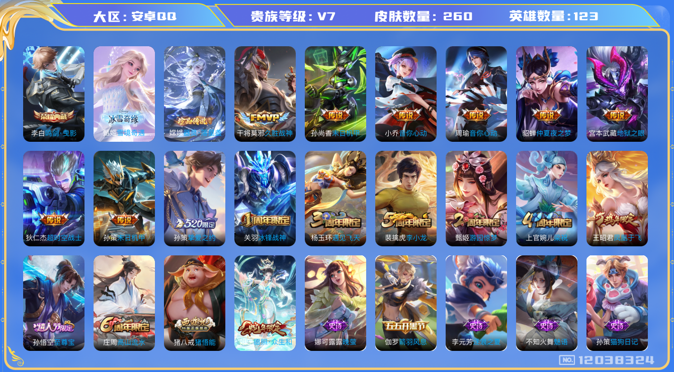 [12038324]暑期末清货/特价急出/永久包赔【商品标题】:安卓Q-V7-尊贵铂金I段位-123英雄-260皮肤-1典藏-1无双-1珍品传说-11传说-63史诗