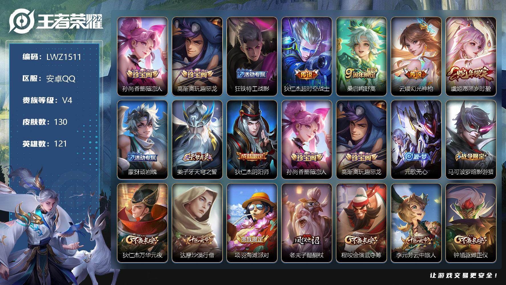 [12037419]【暑期末清货/特价急出/永久包赔】:安卓Q-V4-尊贵铂金II段位-121英雄-130皮肤-4传说-35史诗【传说皮肤】:狄仁杰超时空战士,桑启鸣野蒿,云缨幻光神枪,虞姬愿照岁时盈