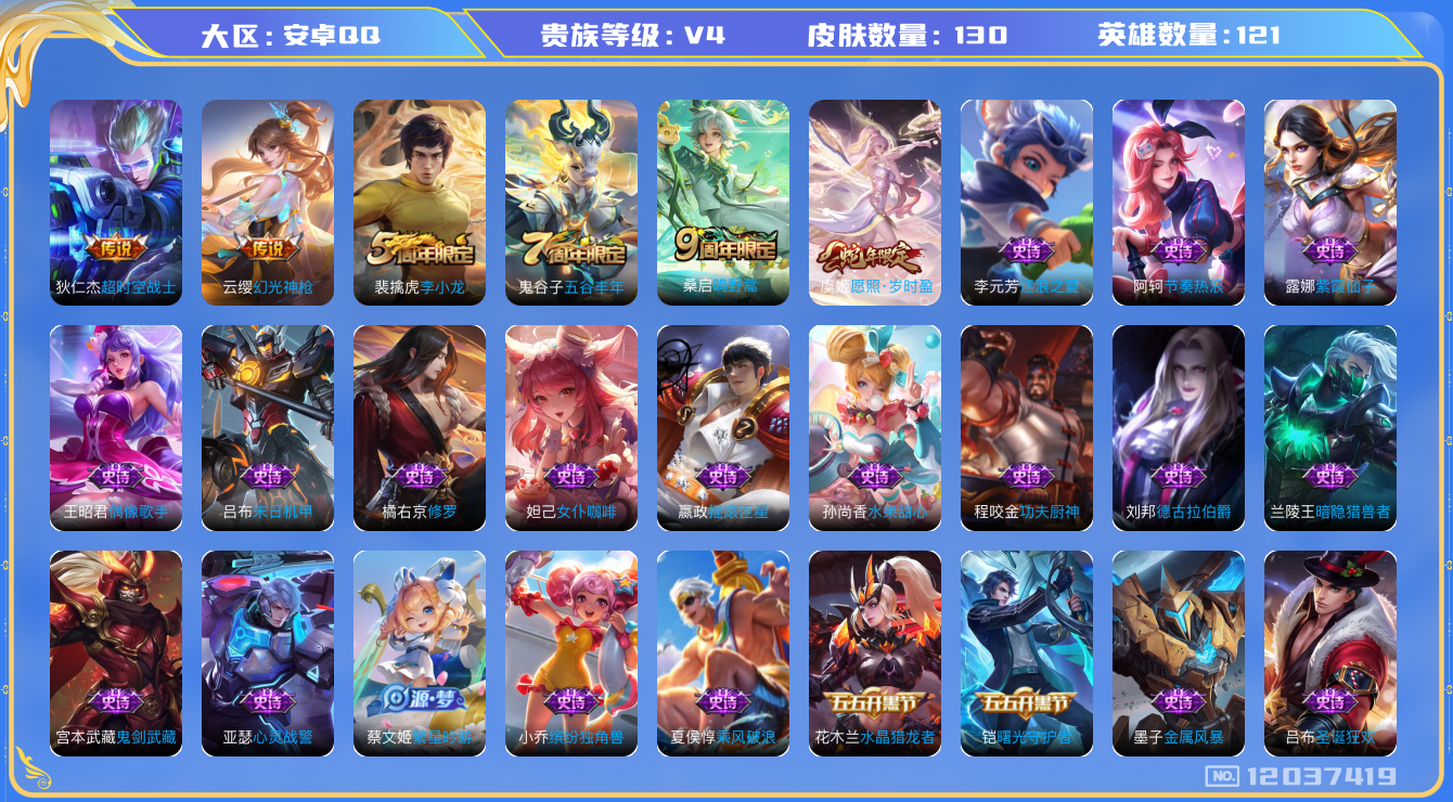 - PX_2089949-实名: 可修改 贵族等级: V6 英雄数: 122 皮肤数: 238 星传说: 星际治安官 传说皮: 胖达荣荣,超时空战士-狄仁杰 限定皮: 李小龙,岱宗,飞衡,高山流水,五谷丰年,山海·玄木吟,鸣野蒿,逐霄战戟,愿照·九州拓