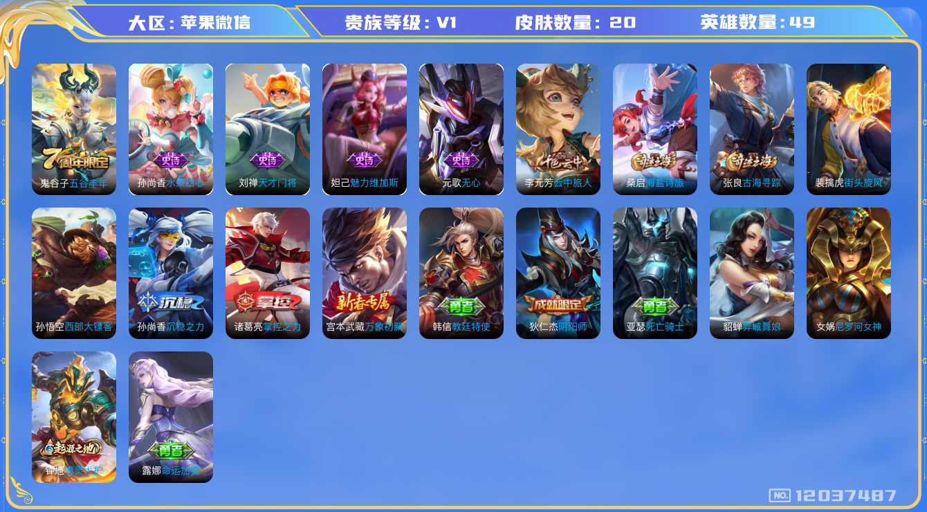 [12037487]【特价急出/详情看图】:苹果WX-V0-永恒钻石IV段位-49英雄-20皮肤-5史诗【限定皮肤】:狄仁杰阴阳师,元歌无心,李元芳云中旅人,鬼谷子五谷丰年,桑启海盐诗旅,张良古海寻踪【赛季限定】:张良古海寻踪,李元芳云中旅人,桑启海盐诗旅【史诗皮肤】:孙尚香水果甜心,妲己魅力维加斯,刘禅天才门将,鬼谷子五谷丰年,元歌无心【其他皮肤】:韩信教廷特使,亚瑟死亡骑士,宫本武藏万象初新,狄仁杰阴阳师,孙尚香沉稳之力,诸葛亮掌控之力,李元芳云中旅人,桑启海盐诗旅,张良古海寻踪,钟馗虚灵犬护,露娜命运加冕,貂蝉异域舞娘,孙悟空西部大镖客,女娲尼罗河女神,裴擒虎街头旋风