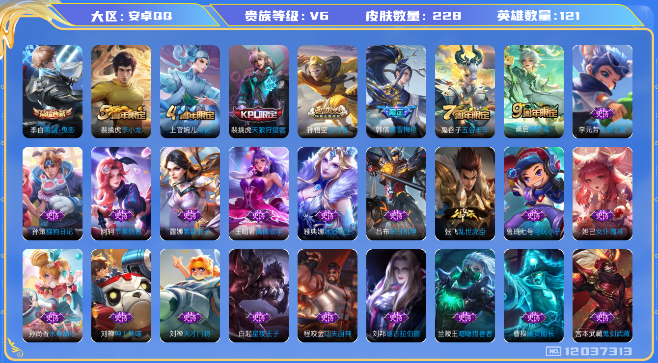 [12037313]【暑期末清货/特价急出/永久包赔】:安卓Q-V6-至尊星耀I段位-121英雄-228皮肤-1典藏-1传说-62史诗【荣耀典藏】:李白鸣剑曳影【传说皮肤】:桑启鸣野蒿【史诗皮肤】:蒙犽顽岩魄,蔡文姬夏日便利店,妲己女仆咖啡,廉颇地狱岩魂,小乔缤纷独角兽,赵云未来纪元,赵云皇家上将,墨子金属风暴,嬴政优雅恋人,孙尚香水果甜心,鲁班七号电玩小子,刘禅绅士熊喵,刘禅天才门将,刘禅电玩爆裂旋风,阿轲节奏热浪,钟无艳超时空战士,扁鹊奇幻香踪,白起星夜王子,吕布圣诞狂欢,吕布末日机甲,元歌无心,夏侯惇乘风破浪,甄姬冰雪圆舞曲,曹操幽灵船长,宫本武藏鬼剑武藏,李白千年之狐,狄仁杰魔术师,狄仁杰鹰眼统帅,老夫子航海奇遇记,关羽百相守梦,貂蝉圣诞恋歌,程咬金功夫厨神,露娜紫霞仙子,刘邦德古拉伯爵,韩信傲雪梅枪,王昭君偶像歌手,兰陵王暗隐猎兽者,花木兰水晶猎龙者,孙悟空孙行者,张飞乱世虎臣,李元芳逐浪之夏,李元芳银河之约,钟馗乐园奇幻夜,杨戬天秀启明,雅典娜冰冠公主,蔡文姬舞动绿茵,鬼谷子五谷丰年,黄忠火炮绅士,百里玄策原初追逐者,百里守约特工魅影,裴擒虎天狼狩猎者,裴擒虎李小龙,狂铁电玩高手,云中君纤云弄巧,孙策猫狗日记,上官婉儿梁祝,蒙犽狂想玩偶喵,暃星界游侠,阿古朵江河有灵