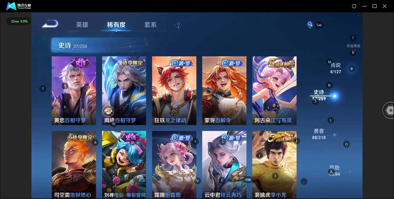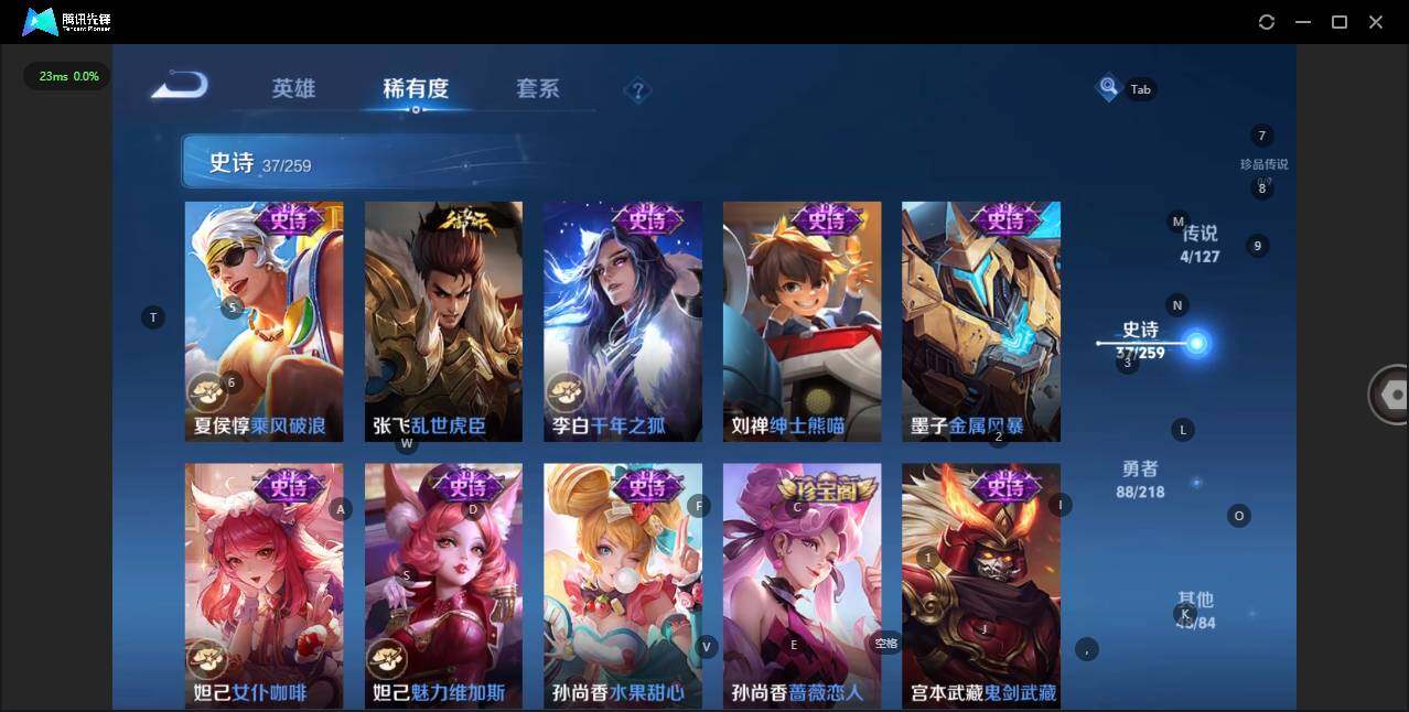 - [12087490]V8 1典藏 14传说 125英雄 263皮肤 可修改实名 优质装备:鸣剑·曳影,云鹰飞将(小将军),炽阳神光,一念神魔,乞巧织情,时之恋人-刘备(电焊工),超时空战士-狄仁杰,碎云,澜逐花归海,涂山容容 珍宝阁皮:胡桃夹子,蔷薇恋人 限定皮:鸣野蒿,傲雪梅枪,时雨天司(水龙头),神威(电光马子),瑞麟志(木兰年限),高山流水,诗剑行,五谷丰年,梁祝,天狼狩猎者,李小龙,朱雀志(守约年限),辉光之辰,孙行者,匿光追影者,百木心枪,玉兔公主,深海之息(深海大菠萝),枫霜尽,匿光启智者,山海·玄木吟(马可年限) 史诗皮:星界战将,龙之律动,百相守梦-周瑜,炽弈燎原,破空之剑,战舞者,蒙犽顽岩魄,百相守梦-黄忠,紫霞仙子,电玩小子(小书包),黄金分割率,特工魅影,千年之狐,永昼,江河有灵,魅语,蒙恬荣光圣徽,偶像歌手,晚萤,电玩·爆裂旋风,末日机甲-吕布,猫狗日记-孙策,猫狗日记-大乔,节奏热浪,修罗,摇滚巨星,水果甜心,绅士熊喵,星夜王子,心灵骇客,时之奇旅-安琪拉,德古拉伯爵,暗隐猎兽者,幽灵船长,鬼剑武藏,心灵战警,舞动绿茵,地狱岩魂,乘风破浪,逐浪之夏,水晶猎龙者,曙光守护者,热力回旋,箭羽风息,金属风暴,原初追逐者,圣诞狂欢,圣诞恋歌,鹰眼统帅,暗夜贵公子,黎明之约,赏金猎手,无心,未来纪元-赵云