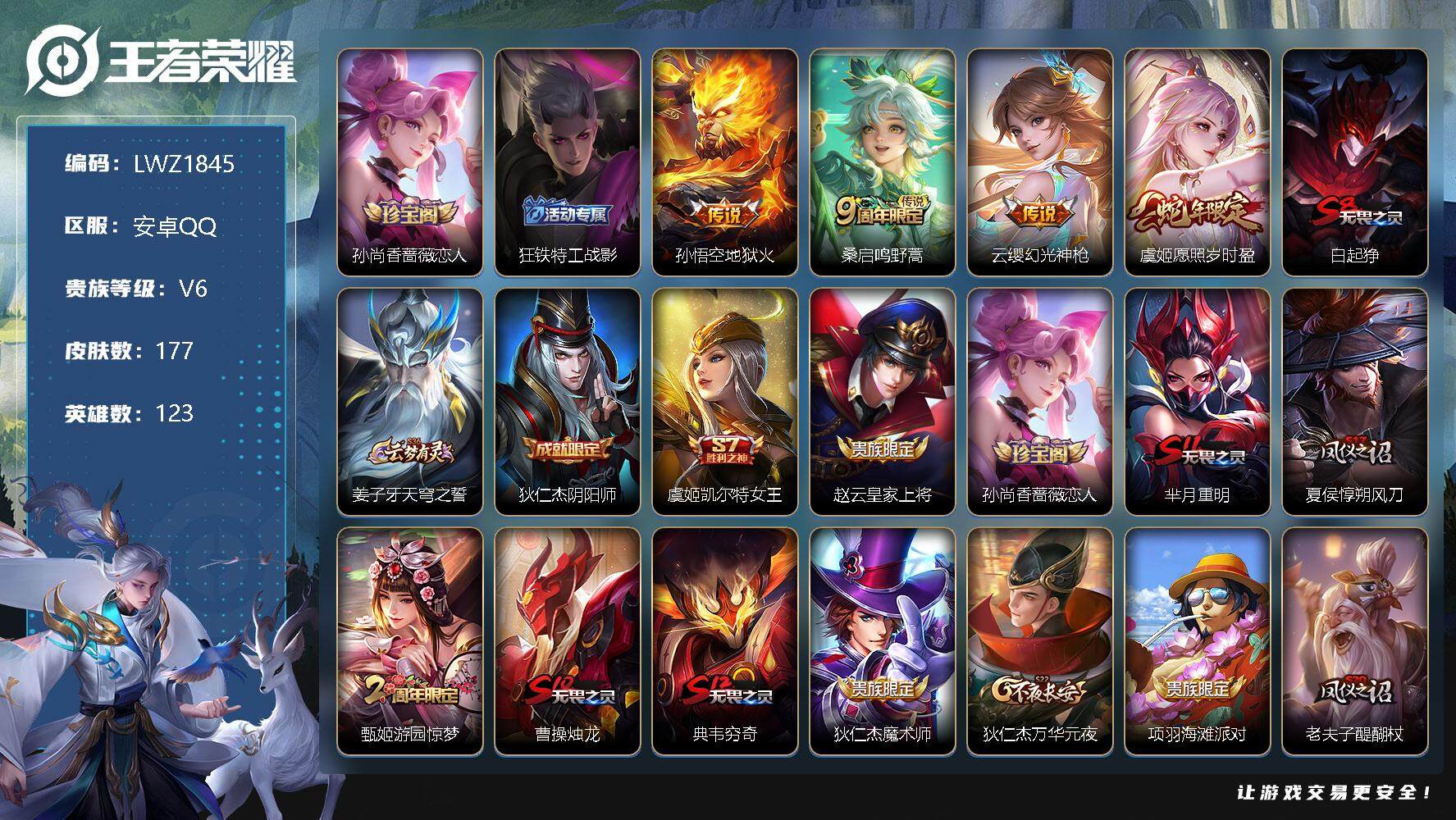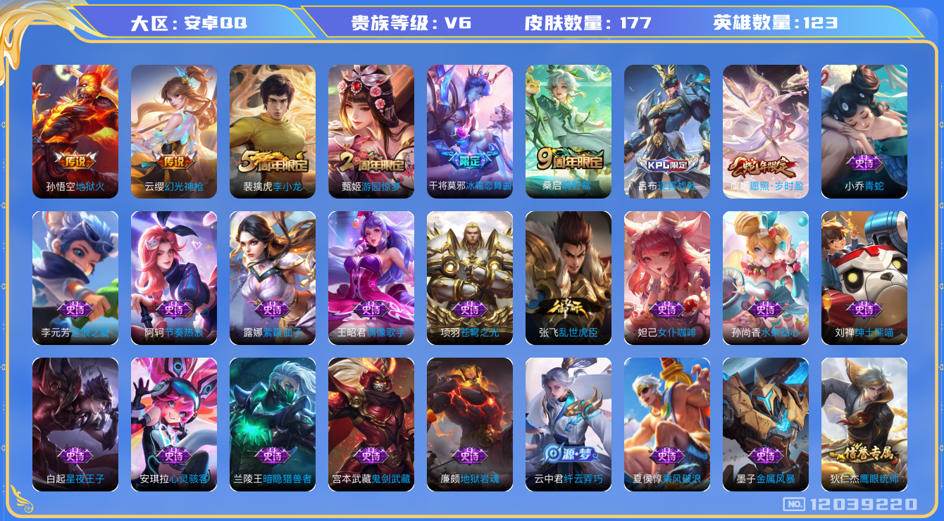 [12039220]【暑期末清货/特价急出/永久包赔】:安卓Q-V6-至尊星耀III段位-123英雄-177皮肤-4传说-37史诗