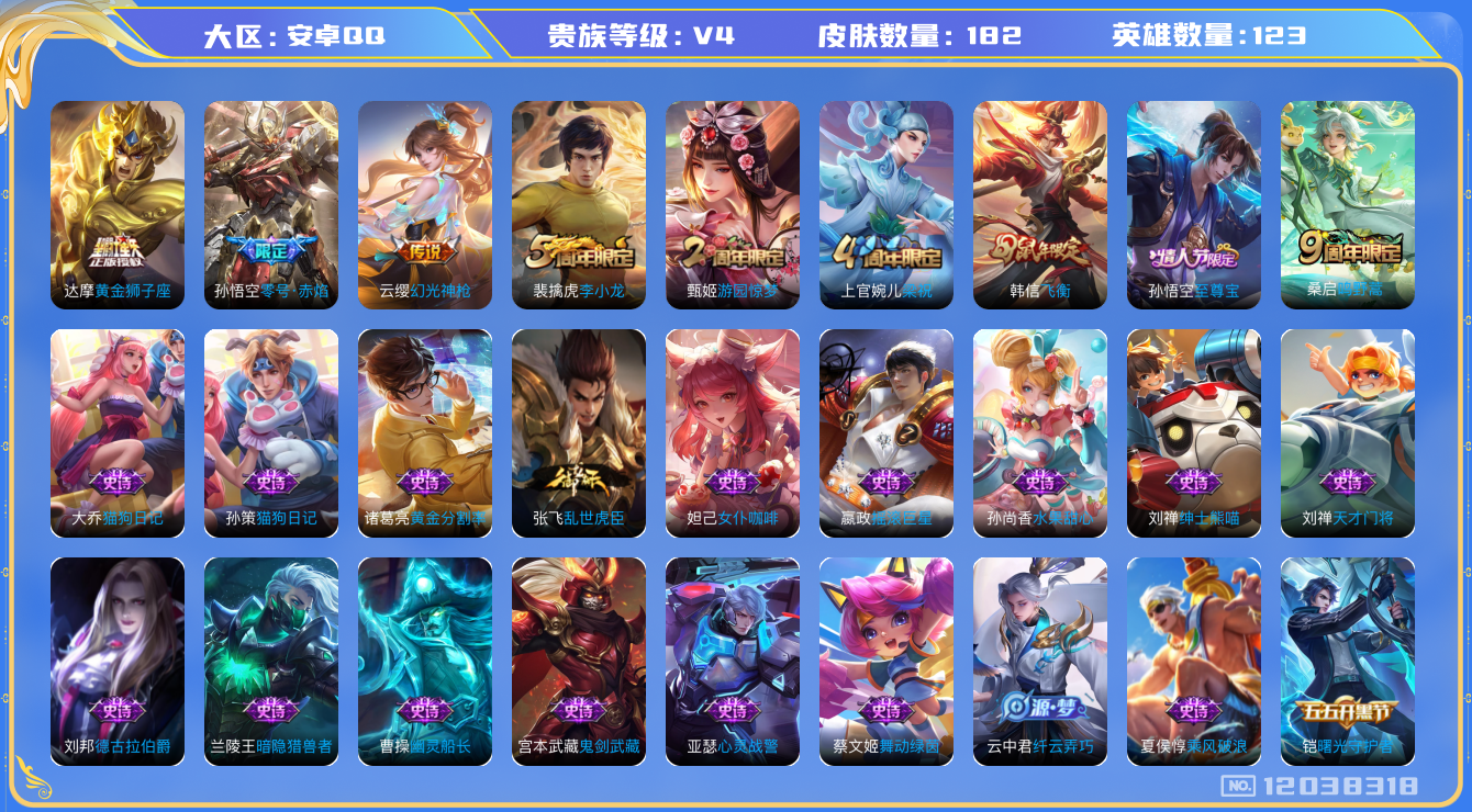 [12038318]暑期末清货/特价急出/永久包赔【商品标题】:安卓Q-V4-永恒钻石I段位-122英雄-182皮肤-4传说-45史诗