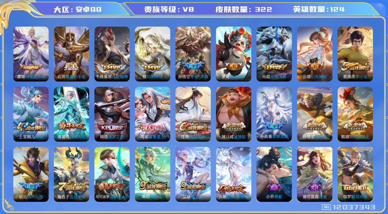 [12037343]【暑期末清货/特价急出/永久包赔】:安卓Q-V8-最强王者段位-124英雄-322皮肤-1典藏-12传说-103史诗【荣耀典藏】:虞姬神鉴启示录【传说皮肤】:后羿黄金射手座,梦奇胖达荣荣,干将莫邪久胜战神,孙悟空零号赤焰,虞姬启明星使,镜炽阳神光,诸葛亮时雨天司,孙尚香异界灵契,马超无双飞将,桑启鸣野蒿,云缨幻光神枪,女娲愿照千秋盛【限定皮肤】:蒙犽顽岩魄,蔡文姬夏日便利店,虞姬夏日便利店,姜子牙天穹之誓,杨戬破阵退雄兵,李白谪仙醉月,狄仁杰阴阳师,赵云皇家上将,赵云百木心枪,墨子神迹守卫,孙尚香蔷薇恋人,孙尚香异界灵契,庄周高山流水,高渐离玩趣恶龙,钟无艳超时空战士,扁鹊奇幻香踪,芈月幻夜卜梦,周瑜真爱至上,元歌云间偶戏,元歌无心,甄姬女儿国国王,甄姬落雪兰心,典韦蓝屏警告,马可波罗山海玄木吟,狄仁杰魔术师,狄仁杰万华元夜,达摩星际陆战队,达摩沙漠行僧,项羽海滩派对,老夫子醍醐杖,老夫子航海奇遇记,关羽百相守梦,程咬金演武夺筹,韩信逐梦之影,兰陵王金庭之子,亚瑟潮玩骑士王,孙悟空零号赤焰,孙悟空孙行者,后羿圣弓游侠,李元芳云中旅人,虞姬启明星使,钟馗驱傩正仪,杨戬潮玩骑兵,干将莫邪真爱魔法,雅典娜黎明之约,蔡文姬繁星吟游,鬼谷子原初探秘者,鬼谷子五谷丰年,诸葛亮时雨天司,黄忠火炮绅士,苏烈千军破阵,弈星混沌棋,沈梦溪大漠名商,明世隐疑决卦,裴擒虎李小龙,裴擒虎擒涛扼浪,米莱狄胡桃异想国,云中君纤云弄巧,猪八戒猪悟能,上官婉儿梁祝,嫦娥拒霜思,嫦娥暖冬兔眠,西施玲珑珍味,鲁班大师探海日志,桑启海盐诗旅,暃星界游侠,戈娅驭风魔法,艾琳流音漫舞,司空震地狱燃心,阿古朵江河有灵,张良古海寻踪,蒙犽百解令,蒙恬荣光圣徽,高渐离燃音魔法,妲己灵卜魔法,鬼谷子天穹祈灯,伽罗琥珀纪元,姬小满妄想食味,沈梦溪龙舞盛年,鲁班七号蔬乡物语,李元芳蔬乡物语,刘邦剑破天穹,程咬金群星魔术团,镜青焰无极,项羽苍威无极,周瑜熔金海岸