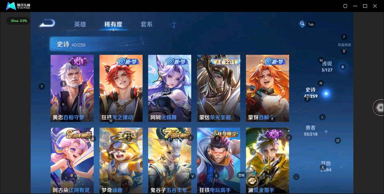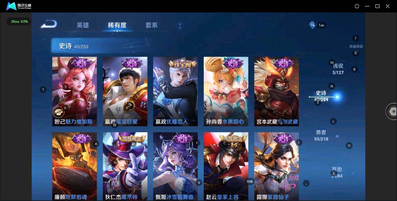 【史诗皮肤】:露娜紫霞仙子,赵云皇家上将,甄姬冰雪圆舞曲,狄仁杰魔术师,廉颇地狱岩魂,宫本武藏鬼剑武藏,孙尚香水果甜心,嬴政优雅恋人,嬴政摇滚巨星,妲己魅力维加斯,张飞乱世虎臣,夏侯惇乘风破浪,雅典娜冰冠公主,蔡文姬舞动绿茵,李元芳逐浪之夏,阿轲节奏热浪,露娜一生所爱,狄仁杰鹰眼统帅,不知火舞魅语,百里玄策原初追逐者,裴擒虎李小龙,元歌云间偶戏,安琪拉时之奇旅,孙悟空孙行者,庄周高山流水,嫦娥拒霜思,黄忠火炮绅士,雅典娜黎明之约,韩信傲雪梅枪,夏洛特永昼,澜赏金猎手,狂铁电玩高手,鬼谷子五谷丰年,梦奇顽趣,阿古朵江河有灵,蒙犽百解令,蒙恬荣光圣徽,阿轲化蝶舞,狂铁龙之律动,黄忠百相守梦