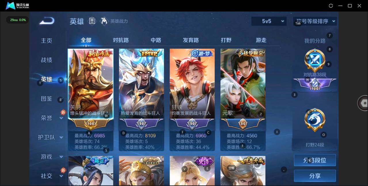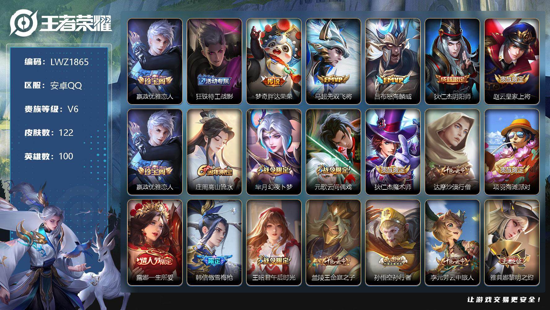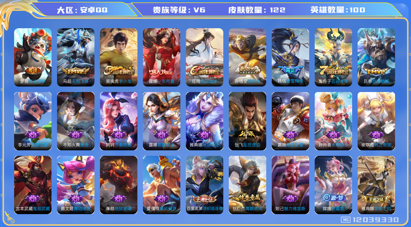 [12039330]对抗路38段【暑期末清货/特价急出/永久包赔】:安卓Q-V6-最强王者段位-100英雄-122皮肤-3传说-40史诗