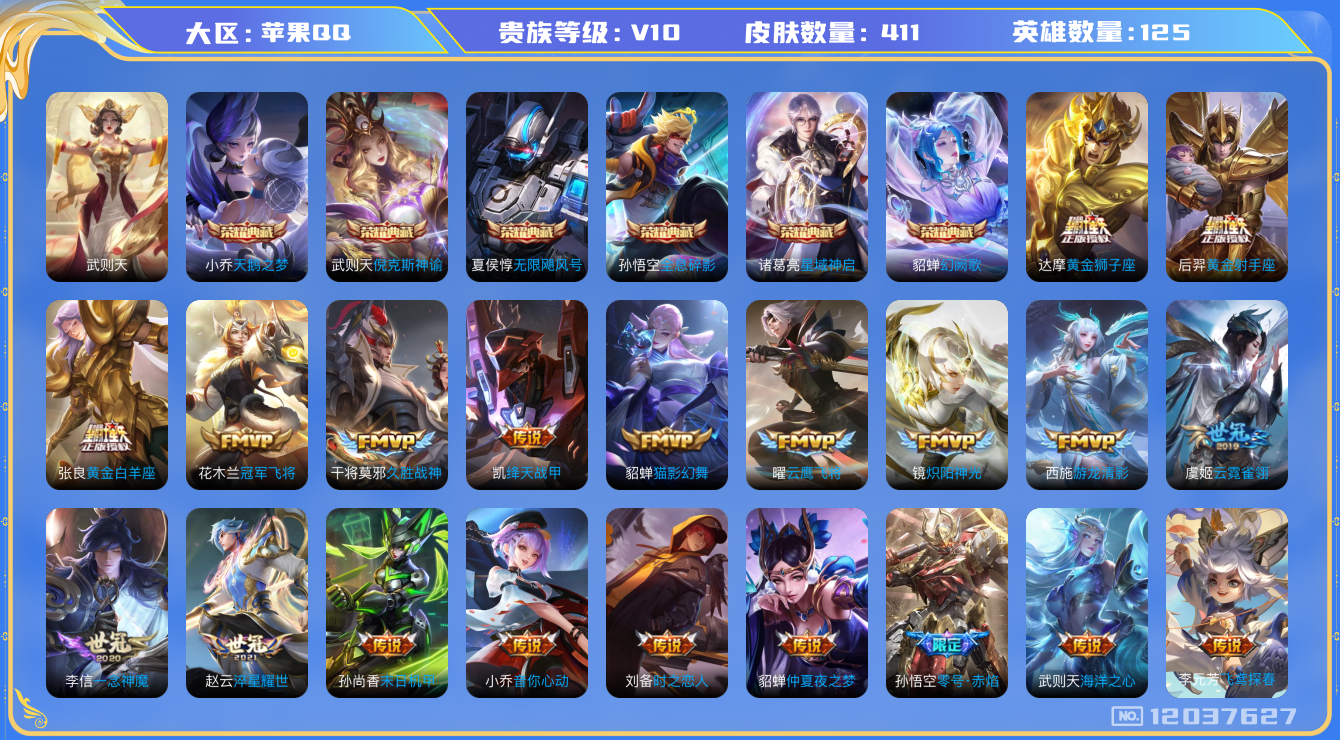 - [11738278]V10 2典藏 2无双 59传说 126英雄 440皮肤 典藏英雄武则天 可修改实名 优质装备:天鹅之梦(小乔典藏),杀手不太冷,韩信群星魔术团(韩信无双),天机白泽,黄金狮子座,黄金射手座,冠军飞将,云鹰飞将(小将军),黄金白羊座,猫影幻舞,久胜战神,炽阳神光,一念神魔,云霓雀翎,末日机甲-孙尚香(绿蚂蚱),地狱火,仲夏夜之梦(大飞蛾),地狱之眼,飞鸢探春,音你心动-周瑜,胖达荣荣,李逍遥,乞巧织情,时之恋人-刘备(电焊工),游龙清影(小青龙),超时空战士-狄仁杰,末日机甲-孙策,花朝如约(花篮子),无双飞将,神器·狴犴令,灼幽烈阳,惊梅引,小动物乐团,霜月吟,澜逐花归海,艾琳觅芳踪,金乌负日,黄金天蝎座,牧神诗旅 传说皮:乘龙·问璇玑(孙尚香年限),乘龙·铭钟鼎(赵云年限),乘龙·淬吴钩(孙策年限),貂蝉曦玄引,吕布曦玄引,典韦战鼓燎原,落雪白狼,九山相柳,云诺千山,祥瑞亨通,幻光神枪 珍宝阁皮:妄想食味,女武神,玩趣恶龙 限定皮:愿照·千秋盛(女娲年限),鸣野蒿,至尊宝,白虎志(电光耗子),凤求凰(白切鸡),凤凰于飞,太华(伽罗年限),武陵仙君(小桃花),傲雪梅枪,时之彼端,白鹤梁神女,神威(电光马子),飞衡(韩信年限),玄嵩(庄周年限),山海·碧波行(瑶年限),遇见飞天,高山流水,诗剑行,怒海麟威,五谷丰年,幽恒(沐浴露),梁祝,御风骁将(吕布年限),岱宗(典韦年限),天狼征服者,天狼绘梦者,李小龙,逐梦之影,朱雀志(守约年限),永曜之星,辉光之辰,如梦令-嫦娥,如梦令-后羿,圣诞老人,一生所爱,大圣娶亲,天魔缭乱,冰霜恋舞曲,乒乒小将,蜜橘之夏,时之祈愿-瑶(瑶传限),枫霜尽,山海·玄木吟(马可年限) 史诗皮:赞萌露比,苍鳞隐世,灵蛊蚀心,星界战将,龙之律动,石田雨龙,百相守梦-周瑜,幻珠鲛人,奇遇星旅,蔬乡物语(鲁班七号),乘龙·聚宝船(安琪拉年限),乘龙·忆丹青(大乔年限),百相守梦-黄忠,遇见神鹿,紫霞仙子,苍穹之光,电玩小子(小书包),白龙吟,黄金分割率,特工魅影,千年之狐,永昼,魅语,高渐离燃音魔法,蒙恬荣光圣徽,无限星赏官,冰冠公主,青蛇,偶像歌手,白蛇,晚萤,龙骑士(小龙虾),末日机甲-吕布,猫狗日记-孙策,猫狗日记-大乔,时之恋人-孙尚香,乱世虎臣,节奏热浪,修罗,女仆咖啡,摇滚巨星,水果甜心,绅士熊喵,天才门将,星夜王子,心灵骇客,功