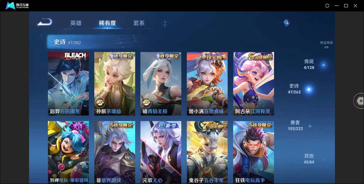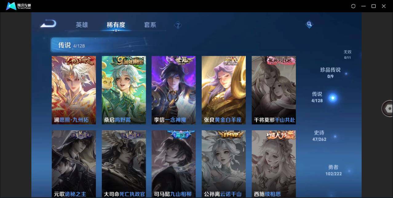 - [12052212]V7 1典藏 3传说 124英雄 217皮肤 可修改实名 优质装备:全息碎影(猴子典藏),云鹰飞将(小将军),地狱火 珍宝阁皮:优雅恋人,蔷薇恋人,玩趣恶龙 限定皮:至尊宝,五谷丰年,梁祝,岱宗(典韦年限),天狼溯光者,李小龙,大圣娶亲,天魔缭乱 史诗皮:化蝶舞,紫霞仙子,白龙吟,黄金分割率,特工魅影,千年之狐,蒙恬荣光圣徽,冰冠公主,偶像歌手,百相守梦(刘备),猫狗日记-孙策,乱世虎臣,节奏热浪,修罗,水果甜心,星夜王子,心灵骇客,功夫厨神,德古拉伯爵,暗隐猎兽者,鬼剑武藏,地狱岩魂,繁星吟游(呼啦呼啦),缤纷独角兽,逐浪之夏,水晶猎龙者,曙光守护者,金属风暴,原初追逐者,鹰眼统帅,魅力维加斯,无心,未来纪元-赵云