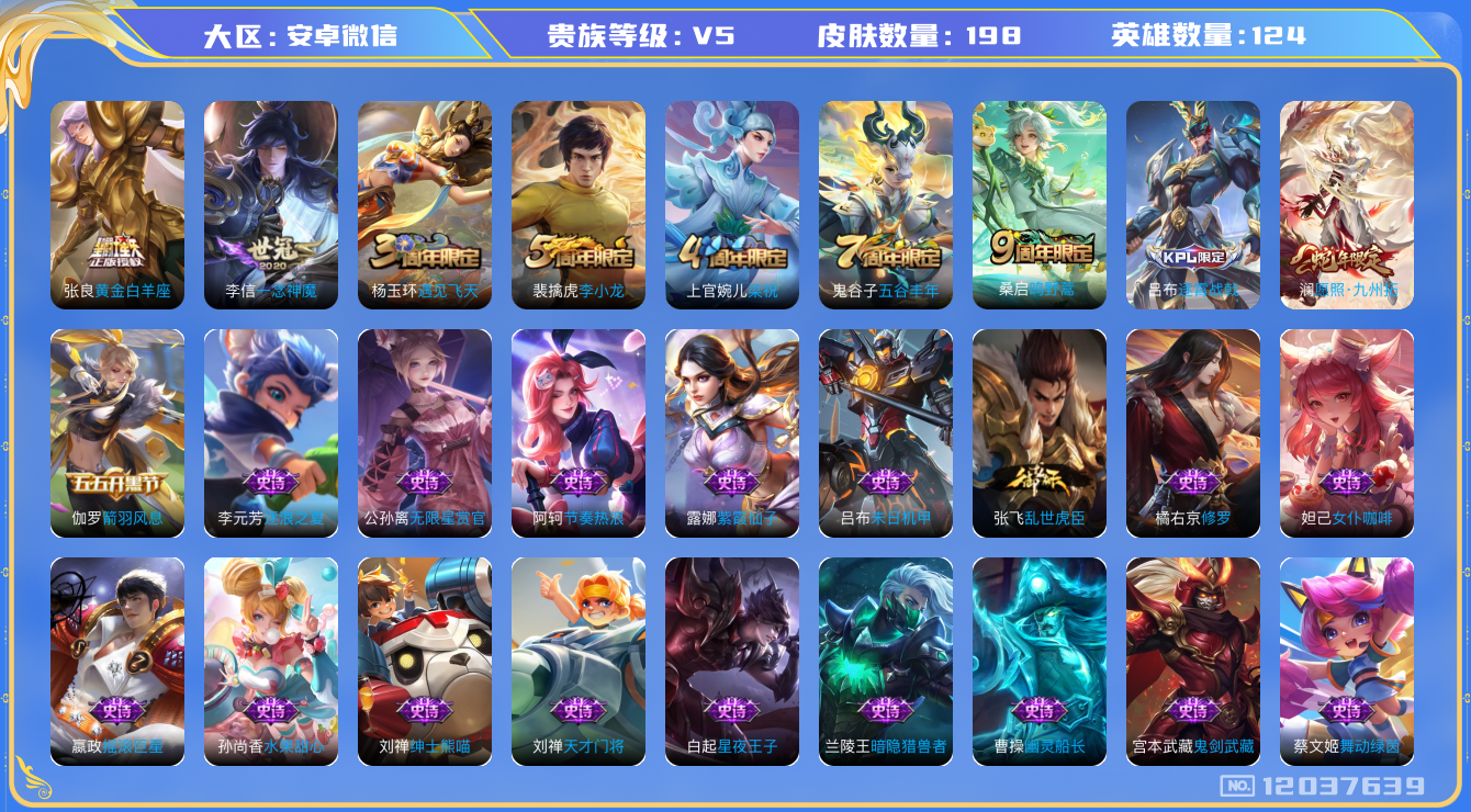 [12037639]社交限制【特价急出/详情看图】:安卓WX-V5-至尊星耀V段位-124英雄-198皮肤-4传说-47史诗