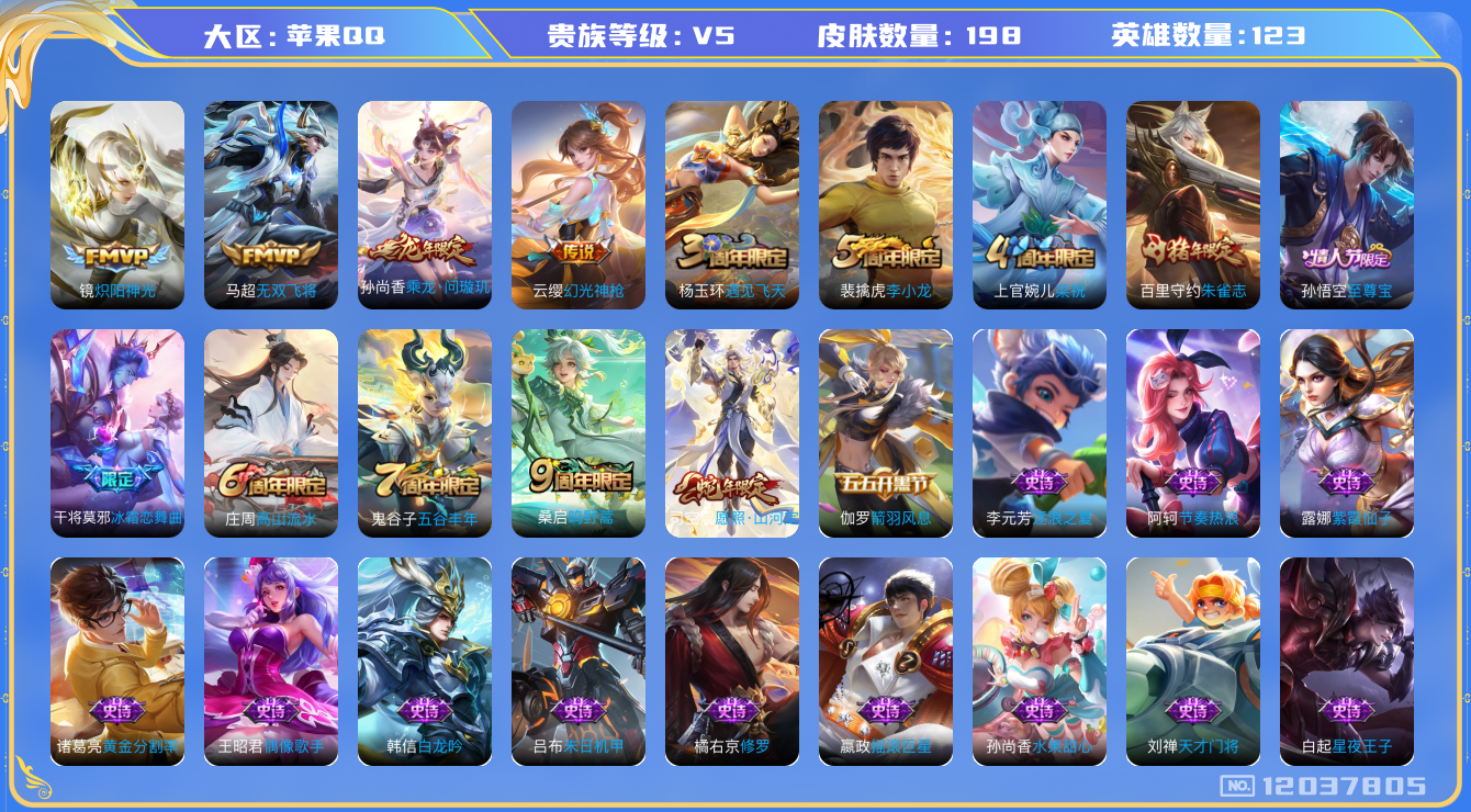 [12037805]【暑期末清货/特价急出/永久包赔】:苹果Q-V5-永恒钻石III段位-123英雄-198皮肤-6传说-55史诗