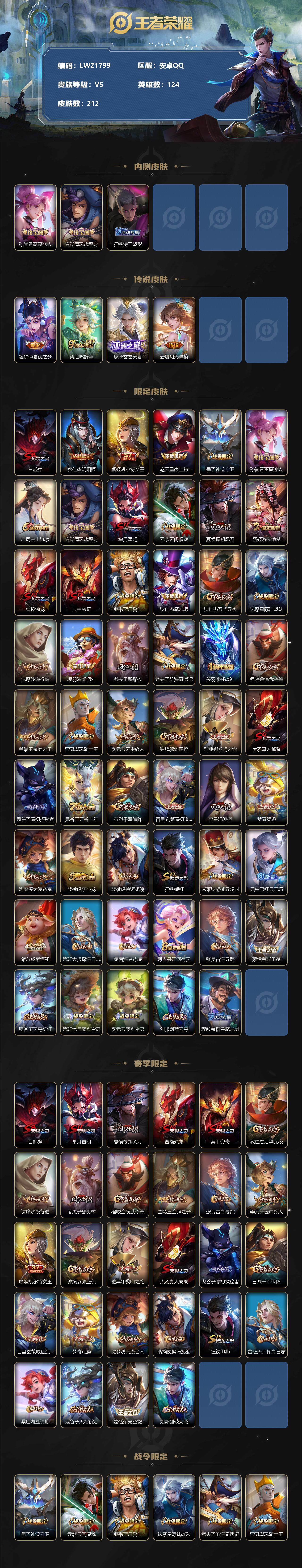 - PX_2106066-实名: 可修改 贵族等级: V7 英雄数: 123 皮肤数: 253 荣耀水晶: 弑枪猎影 传说皮: 云鹰飞将,绛天战甲,一念神魔,超时空战士-狄仁杰,炽翼辉光,霜月吟,琥珀纪元马超,乘龙·问璇玑,貂蝉曦玄引 限定皮: 梁祝,至尊宝,五谷丰年,齐天大圣,鸣野蒿,逐霄战戟