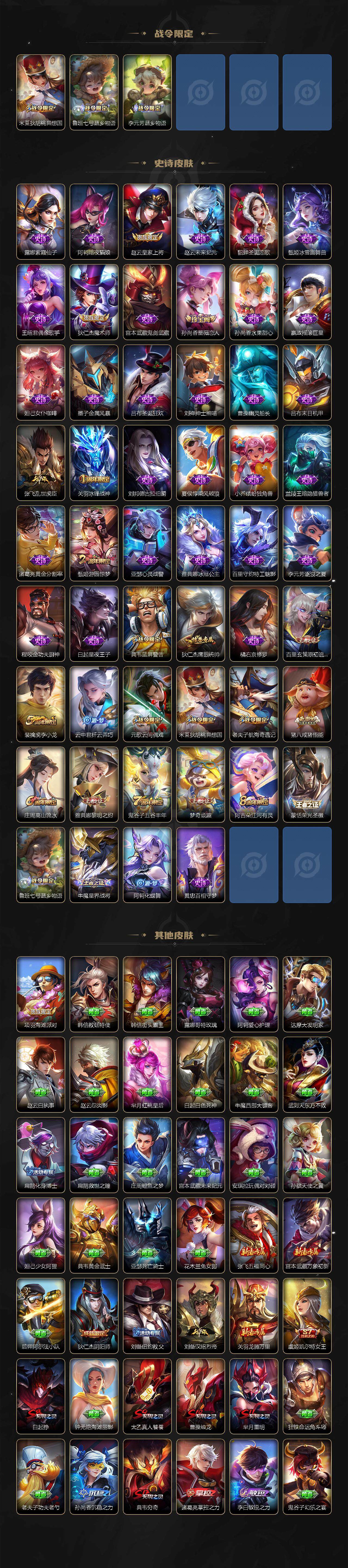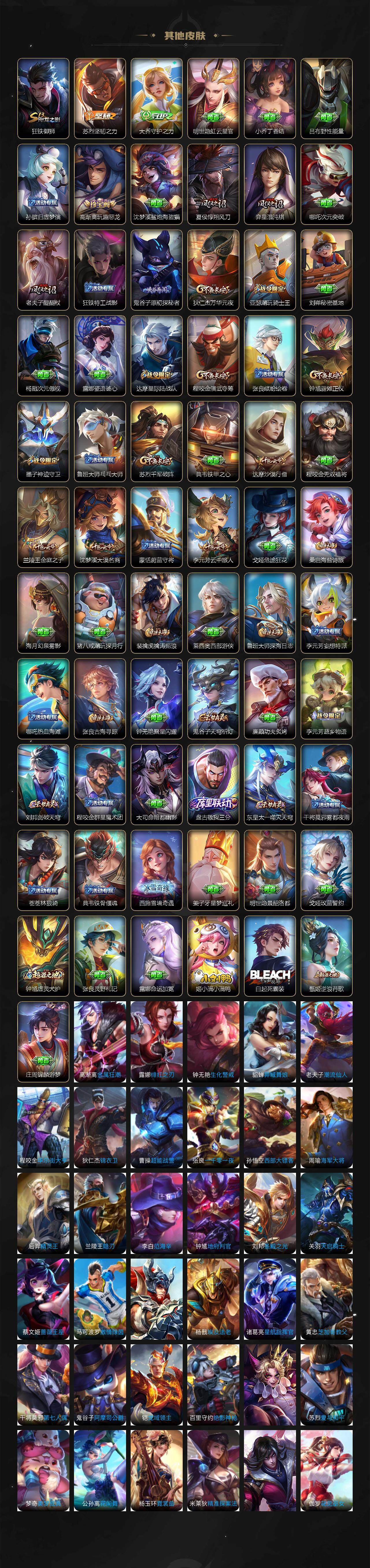 【限定皮肤】:白起狰,狄仁杰阴阳师,虞姬凯尔特女王,赵云皇家上将,墨子神迹守卫,孙尚香蔷薇恋人,庄周高山流水,高渐离玩趣恶龙,芈月重明,元歌云间偶戏,夏侯惇朔风刀,甄姬游园惊梦,曹操烛龙,典韦穷奇,典韦蓝屏警告,狄仁杰魔术师,狄仁杰万华元夜,达摩星际陆战队,达摩沙漠行僧,项羽海滩派对,老夫子醍醐杖,老夫子航海奇遇记,关羽冰锋战神,程咬金演武夺筹,兰陵王金庭之子,亚瑟潮玩骑士王,李元芳云中旅人,钟馗驱傩正仪,雅典娜黎明之约,太乙真人饕餮,鬼谷子原初探秘者,鬼谷子五谷丰年,苏烈千军破阵,百里玄策原初追逐者,弈星混沌棋,梦奇顽趣,沈梦溪大漠名商,裴擒虎李小龙,裴擒虎擒涛扼浪,狂铁御狮,米莱狄胡桃异想国,云中君纤云弄巧,猪八戒猪悟能,鲁班大师探海日志,桑启海盐诗旅,阿古朵江河有灵,张良古海寻踪,蒙恬荣光圣徽,鬼谷子天穹祈灯,鲁班七号蔬乡物语,李元芳蔬乡物语,刘邦剑破天穹,程咬金群星魔术团