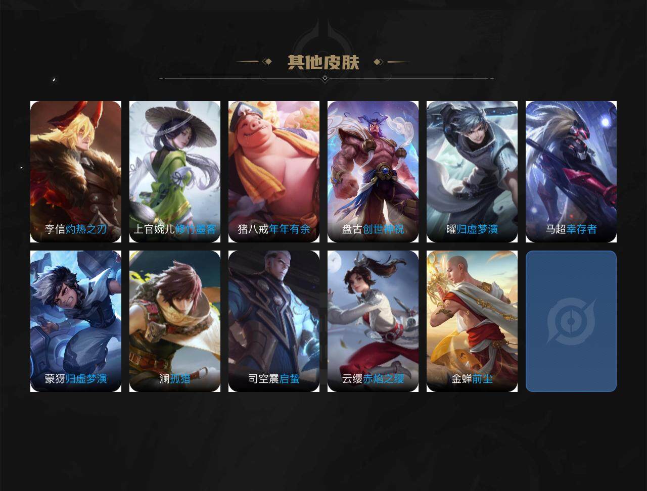 虞姬凯尔特女王,白起狰,太乙真人饕餮,曹操烛龙,芈月重明,典韦穷奇,狂铁御狮,夏侯惇朔风刀,老夫子醍醐杖,鬼谷子原初探秘者,狄仁杰万华元夜,程咬金演武夺筹,钟馗驱傩正仪,苏烈千军破阵,典韦蓝屏警告,元歌云间偶戏,弈星混沌棋,达摩沙漠行僧,兰陵王金庭之子,沈梦溪大漠名商,李元芳云中旅人,桑启海盐诗旅,裴擒虎擒涛扼浪,鲁班大师探海日志,张良古海寻踪