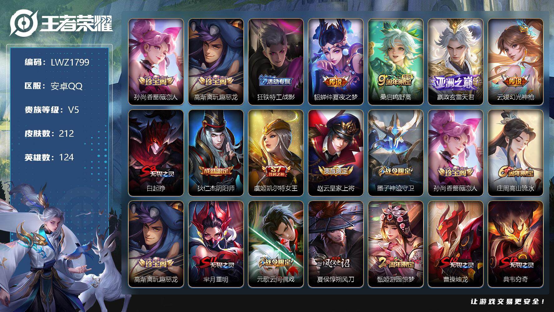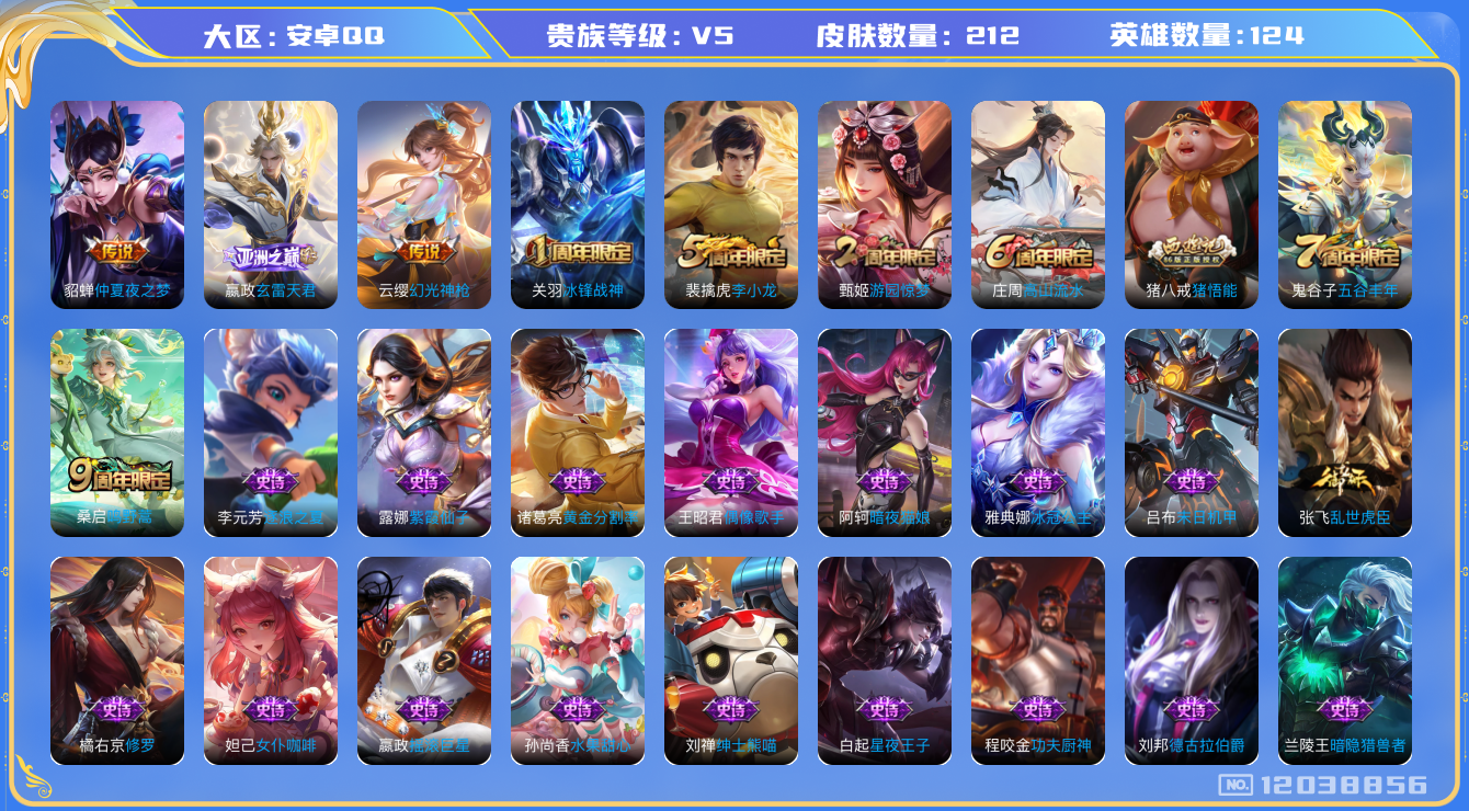 [12038856]【特价急出/永久包赔/商品详情看图】:安卓Q-V5-至尊星耀III段位-124英雄-212皮肤-4传说-52史诗