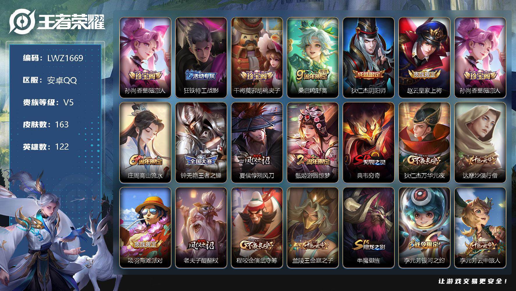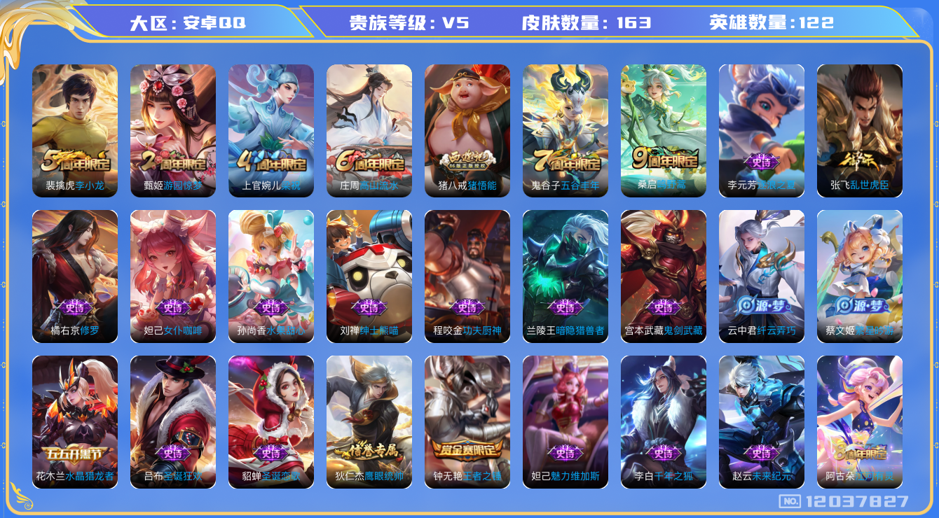 [12037827]【暑期末清货/特价急出/永久包赔】:安卓Q-V5-尊贵铂金II段位-122英雄-163皮肤-1传说-31史诗