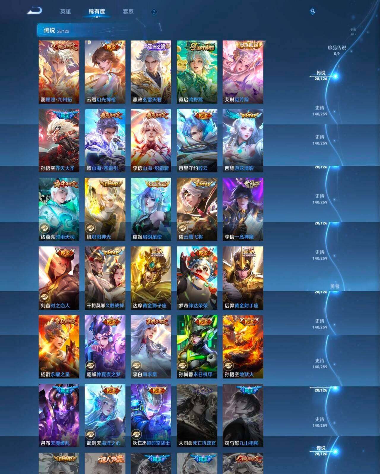 【传说皮肤】:狄仁杰超时空战士,武则天海洋之心,吕布天魔缭乱,孙悟空地狱火,孙尚香末日机甲,李白凤求凰,貂蝉仲夏夜之梦,杨戬永曜之星,后羿黄金射手座,梦奇胖达荣荣,达摩黄金狮子座,干将莫邪久胜战神,刘备时之恋人,李信一念神魔,曜云鹰飞将,虞姬启明星使,镜炽阳神光,诸葛亮时雨天司,西施游龙清影,百里守约碎云,李信山海炽霜斩,曜山海苍雷引,孙悟空齐天大圣,艾琳觅芳踪,桑启鸣野蒿,嬴政玄雷天君,云缨幻光神枪,澜愿照九州拓