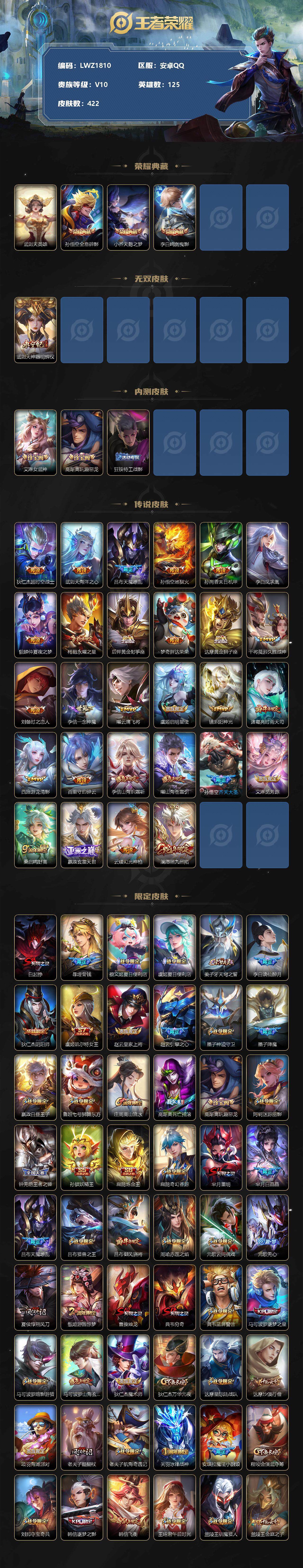- [10977055]【商品标题】:安卓Q-V9-永恒钻石I段位-124英雄-334皮肤-2典藏-0珍品无双-0无双-2珍品传说-29传说-100史诗 【荣耀典藏】:孙悟空全息碎影,韩信弑枪猎影 【珍品传说】:马可波罗怪盗基德,鲁班七号江户川柯南 【内测皮肤】:嬴政优雅恋人,高渐离玩趣恶龙,狂铁特工战影 【传说皮肤】:狄仁杰超时空战士,孙悟空地狱火,宫本武藏地狱之眼,孙尚香末日机甲,李白凤求凰,后羿黄金射手座,梦奇胖达荣荣,达摩黄金狮子座,虞姬云霓雀翎,干将莫邪久胜战神,伽罗太华,刘备时之恋人,李信一念神魔,曜云鹰飞将,虞姬启明星使,镜炽阳神光,诸葛亮时雨天司,曜李逍遥 ,赵云淬星耀世,孙策末日机甲,百里守约碎云,李白诗剑行,露娜霜月吟,澜逐花归海,孙策乘龙淬吴钩,典韦战鼓燎原,云缨幻光神枪,澜愿照九州拓,妲己愿照众生和 【限定皮肤】:姜子牙天穹之誓,狄仁杰阴阳师,赵云皇家上将,墨子神迹守卫,墨子降魔,嬴政优雅恋人,嬴政白昼王子,鲁班七号狮舞东方,庄周高山流水,高渐离死亡摇滚,高渐离玩趣恶龙,阿轲迷踪丽影,钟无艳超时空战士,芈月重明,芈月幻夜卜梦,吕布猎兽之王,元歌云间偶戏,夏侯惇朔风刀,甄姬游园惊梦,甄姬落雪兰心,曹操烛龙,典韦穷奇,典韦蓝屏警告,典韦岱宗,马可波罗逐梦之星,马可波罗暗影游猎,狄仁杰魔术师,狄仁杰万华元夜,达摩星际陆战队,达摩沙漠行僧,项羽海滩派对,老夫子醍醐杖,老夫子航海奇遇记,关羽冰锋战神,程咬金演武夺筹,刘邦夺宝奇兵,韩信逐梦之影,韩信傲雪梅枪,王昭君午后时光,兰陵王金庭之子,亚瑟潮玩骑士王,孙悟空至尊宝,孙悟空大圣娶亲,孙悟空孙行者,牛魔御旌,后羿如梦令,后羿圣弓游侠,李元芳银河之约,李元芳云中旅人,虞姬霸王别姬,虞姬启明星使,钟馗神迹守卫,钟馗驱傩正仪,干将莫邪真爱魔法,雅典娜单词大作战,雅典娜黎明之约,蔡文姬繁星吟游,鬼谷子原初探秘者,鬼谷子五谷丰年,诸葛亮时雨天司,黄忠火炮绅士,铠青龙志,苏烈千军破阵,百里玄策原初追逐者,百里守约朱雀志,弈星混沌棋,沈梦溪星空之诺,沈梦溪大漠名商,明世隐疑决卦,裴擒虎李小龙,狂铁御狮,狂铁电玩高手,米莱狄御霄,米莱狄胡桃异想国,云中君纤云弄巧,伽罗太华,盾山御銮,盾山梦圆繁星,猪八戒西部大镖客,上官婉儿梁祝,嫦娥拒霜思,嫦娥暖冬兔眠,曜李逍遥 ,蒙犽狂想玩偶喵,桑启海盐诗旅,金蝉唐三藏,张良古海寻踪,高渐离燃音魔法,妲己
