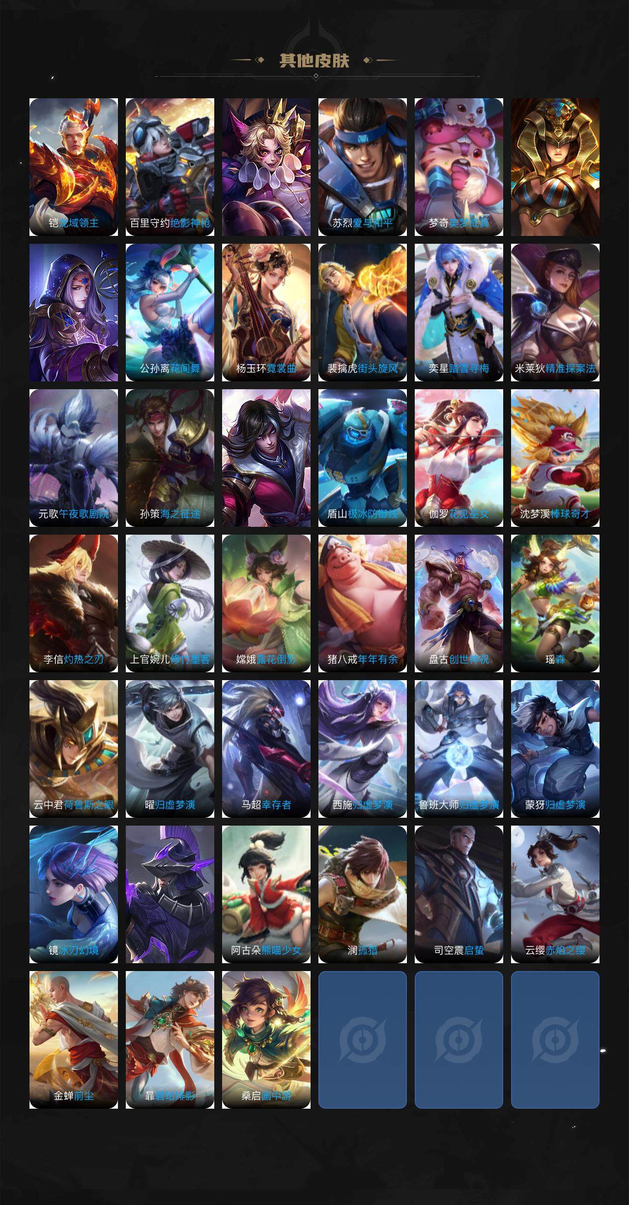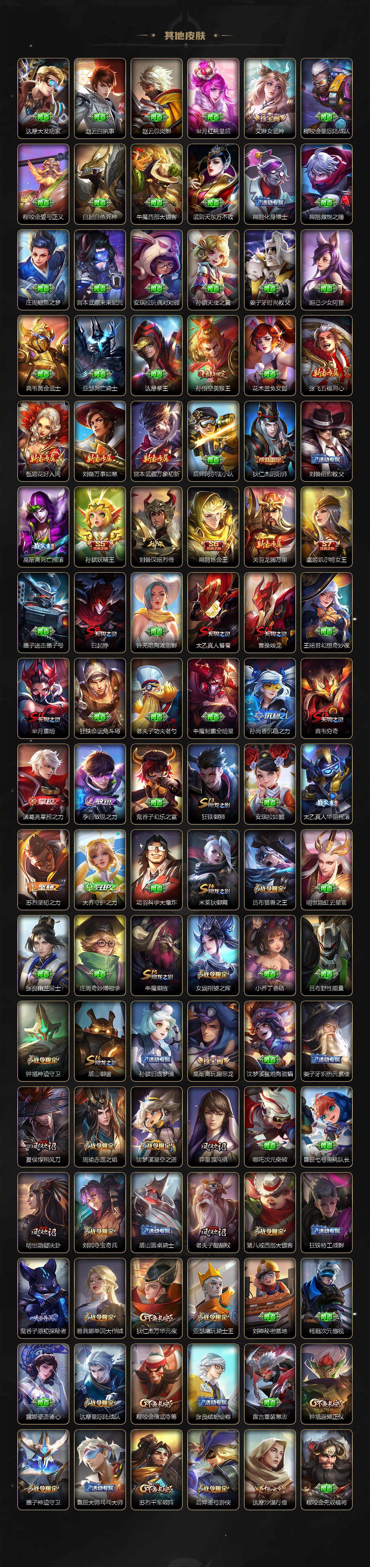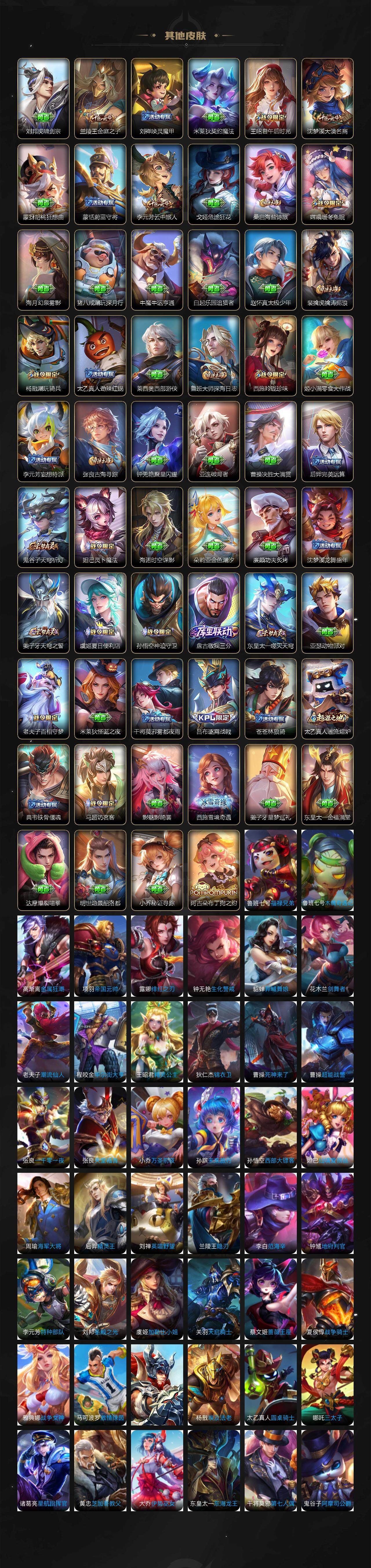 【限定皮肤】:白起狰,暃埋骨钱,蔡文姬夏日便利店,虞姬夏日便利店,姜子牙天穹之誓,李白谪仙醉月,狄仁杰阴阳师,虞姬凯尔特女王,赵云皇家上将,赵云引擎之心,墨子神迹守卫,墨子降魔,嬴政白昼王子,鲁班七号狮舞东方,庄周高山流水,高渐离死亡摇滚,高渐离玩趣恶龙,阿轲迷踪丽影,钟无艳王者之锤,孙膑妖精王,扁鹊炼金王,扁鹊奇幻香踪,芈月重明,芈月白晶晶,吕布天魔缭乱,吕布猎兽之王,吕布御风骁将,周瑜赤莲之焰,元歌云间偶戏,元歌无心,夏侯惇朔风刀,甄姬游园惊梦,曹操烛龙,典韦穷奇,典韦蓝屏警告,马可波罗逐梦之星,马可波罗暗影游猎,马可波罗山海玄木吟,狄仁杰魔术师,狄仁杰万华元夜,达摩星际陆战队,达摩沙漠行僧,项羽海滩派对,老夫子醍醐杖,老夫子航海奇遇记,关羽冰锋战神,安琪拉魔法小厨娘,程咬金演武夺筹,刘邦夺宝奇兵,韩信逐梦之影,韩信飞衡,王昭君午后时光,兰陵王驯魔猎人,兰陵王金庭之子,花木兰青春决赛季,花木兰瑞麟志,亚瑟潮玩骑士王,孙悟空美猴王,孙悟空至尊宝,孙悟空大圣娶亲,孙悟空齐天大圣,牛魔御旌,后羿辉光之辰,后羿圣弓游侠,李元芳银河之约,李元芳云中旅人,虞姬霸王别姬,虞姬启明星使,钟馗神迹守卫,钟馗驱傩正仪,杨玉环遇见飞天,杨戬永曜之星,杨戬潮玩骑兵,女娲朔望之晖,哪吒逐梦之翼,干将莫邪真爱魔法,雅典娜单词大作战,雅典娜黎明之约,蔡文姬繁星吟游,太乙真人饕餮,太乙真人华丽摇滚,东皇太一逐梦之光,鬼谷子原初探秘者,鬼谷子五谷丰年,诸葛亮时雨天司,黄忠烈魂,黄忠火炮绅士,苏烈千军破阵,百里玄策原初追逐者,弈星混