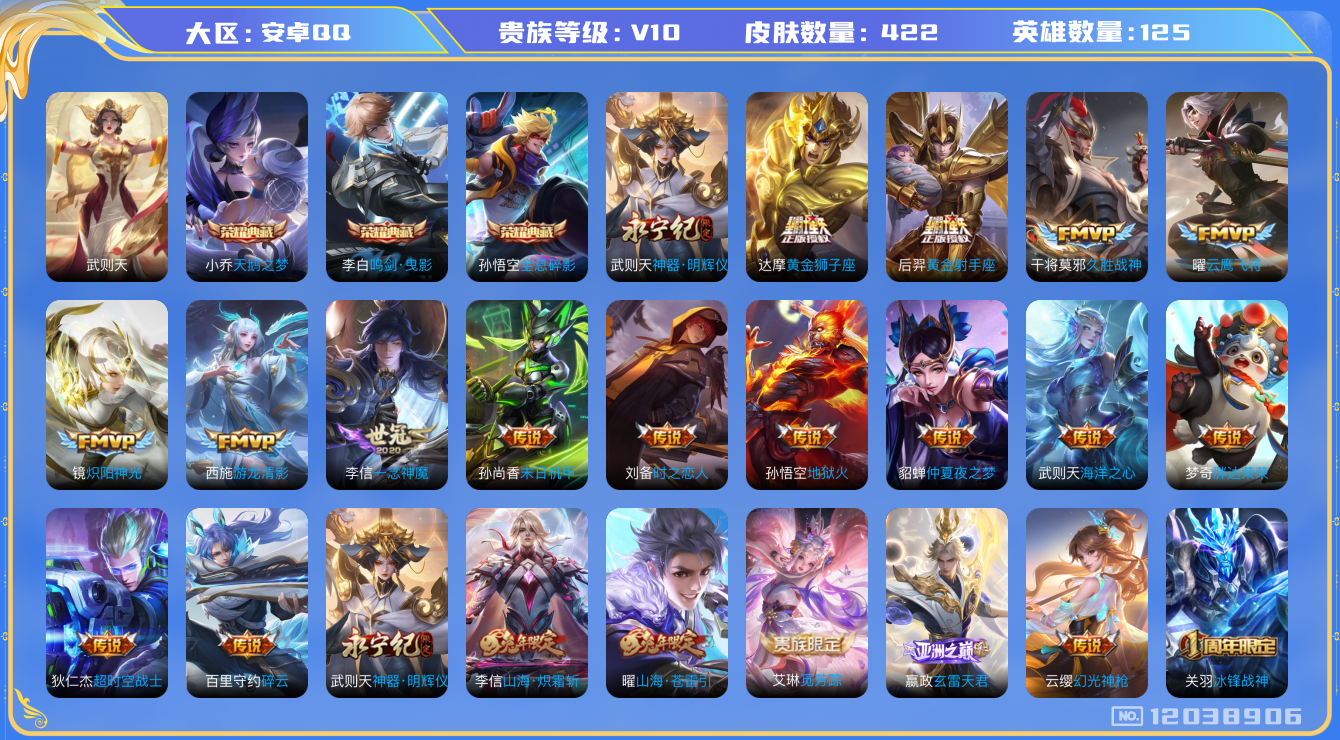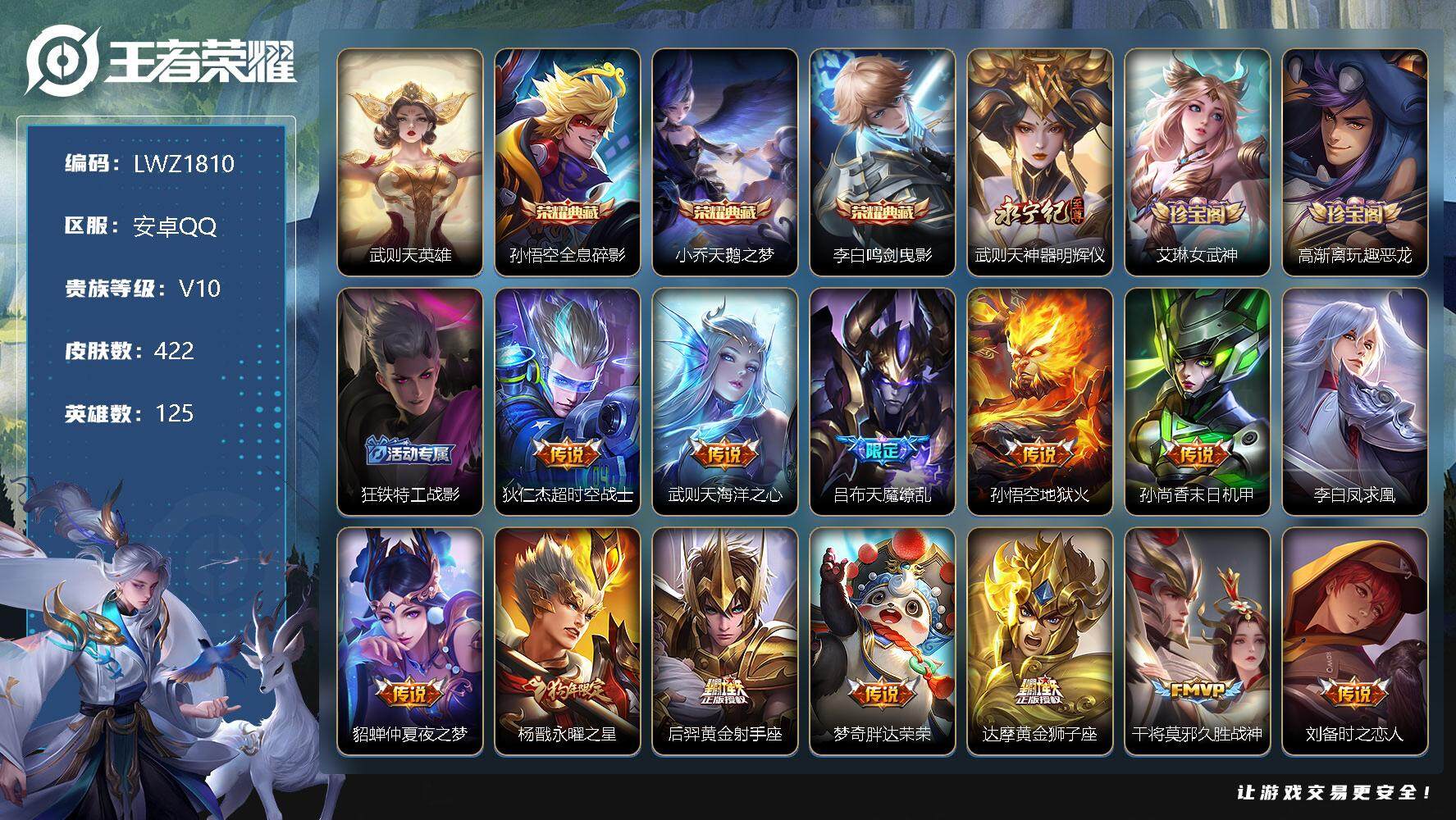 [12038906]暑期末清货/特价急出/永久包赔:安卓Q-V10-422皮肤-4典藏-1无双-28传说-140史诗