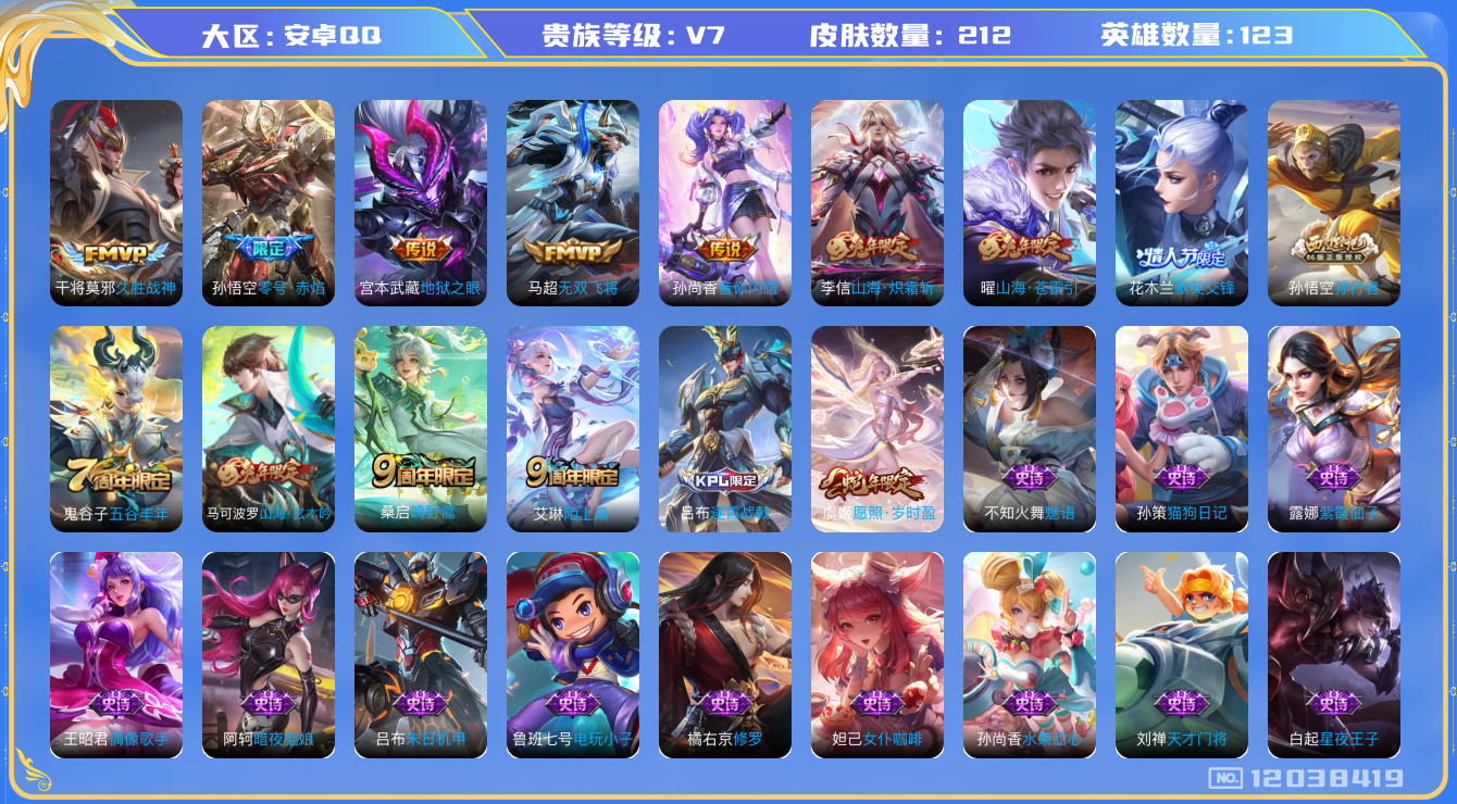 [12038419]暑期末清货/特价急出/永久包赔打野31段【商品标题】:安卓Q-V7-至尊星耀I段位-123英雄-212皮肤-9传说-60史诗