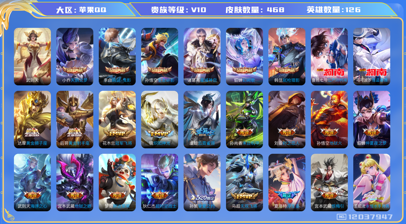 [12037947]暑期末清货/特价急出/永久包赔贵族10/皮肤467/典藏6/传说44/史诗164/英雄126