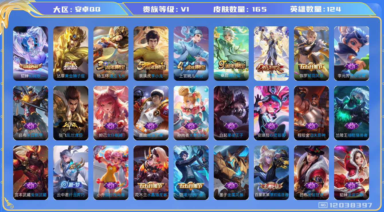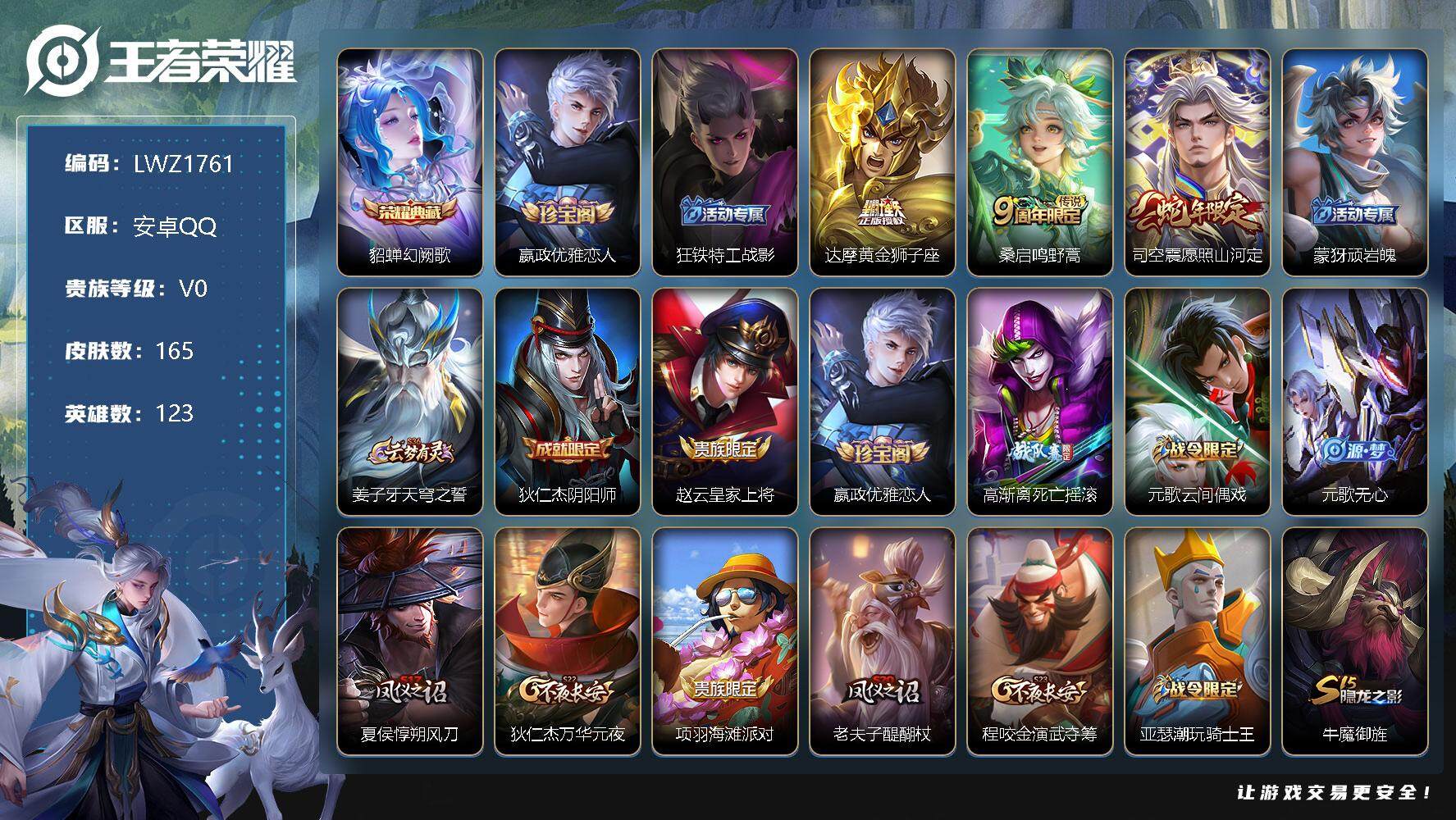 [12038397]暑期末清货/特价急出/永久包赔【商品标题】:安卓Q-V0-至尊星耀III段位-123英雄-165皮肤-1典藏-3传说-39史诗