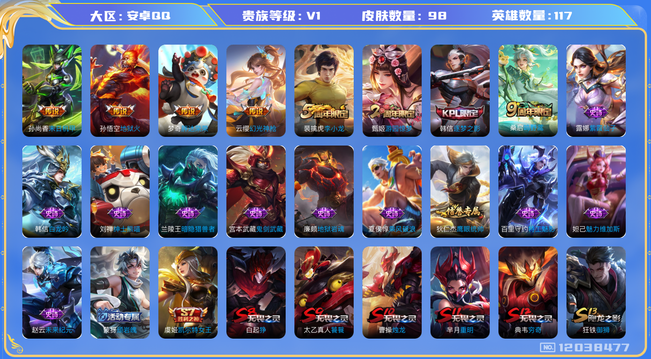 [12038477]暑期末清货/特价急出/永久包赔【商品标题】:安卓Q-V0-永恒钻石III段位-116英雄-98皮肤-5传说-17史诗