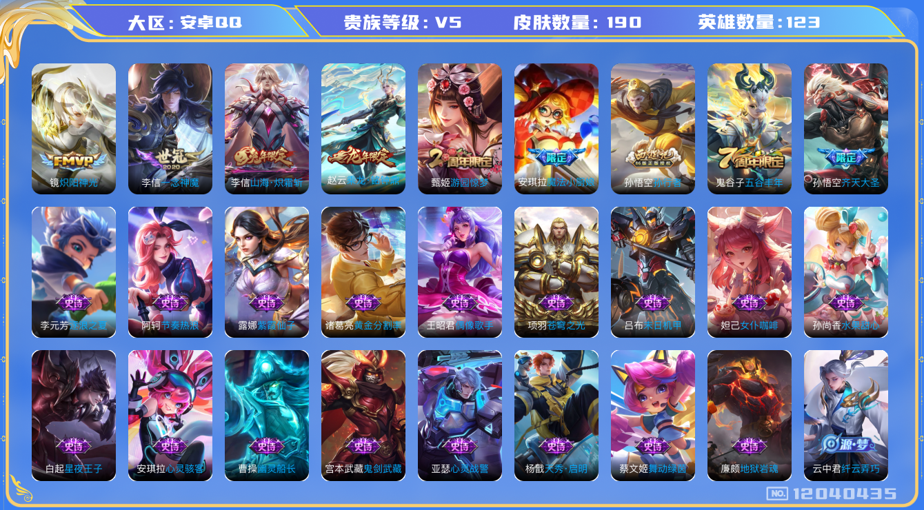 [12040435]【特价急出/详情看图】:安卓Q-V5-至尊星耀I段位-123英雄-190皮肤-5传说-59史诗