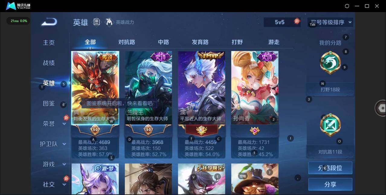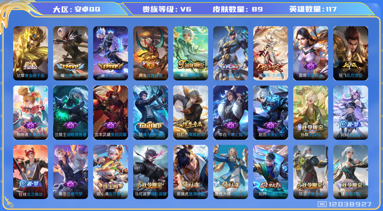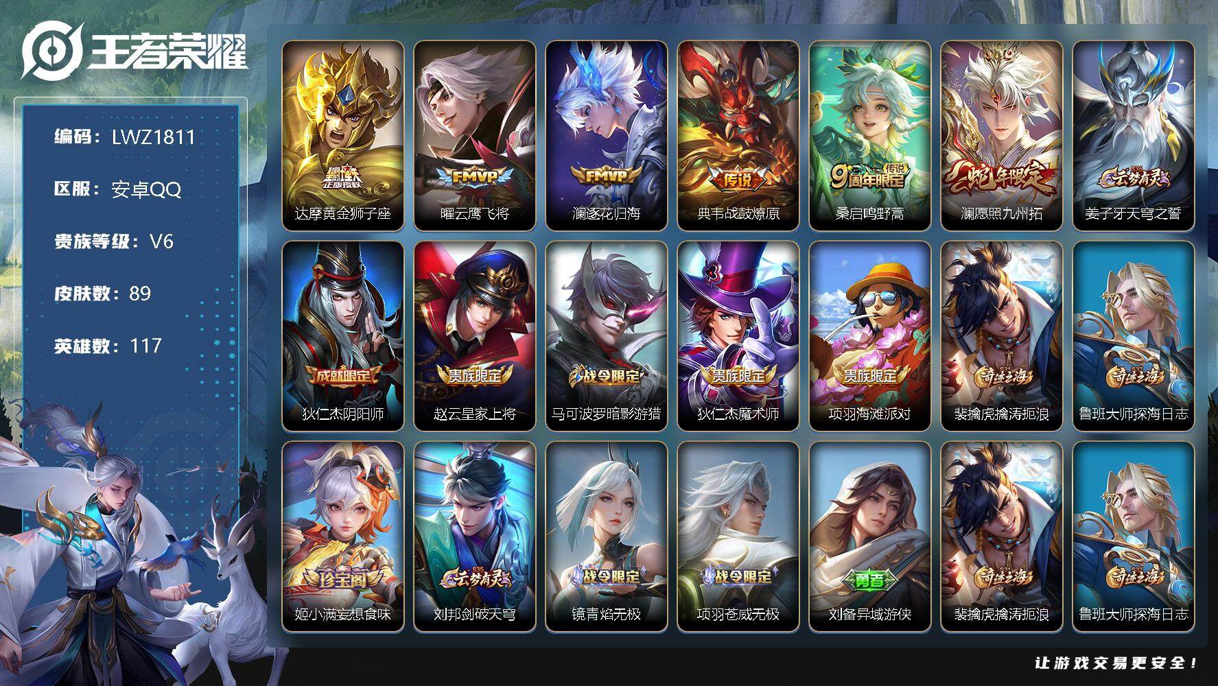 [12038927]暑期末清货/特价急出/永久包赔【商品标题】:安卓Q-V6-最强王者段位-117英雄-89皮肤-6传说-18史诗