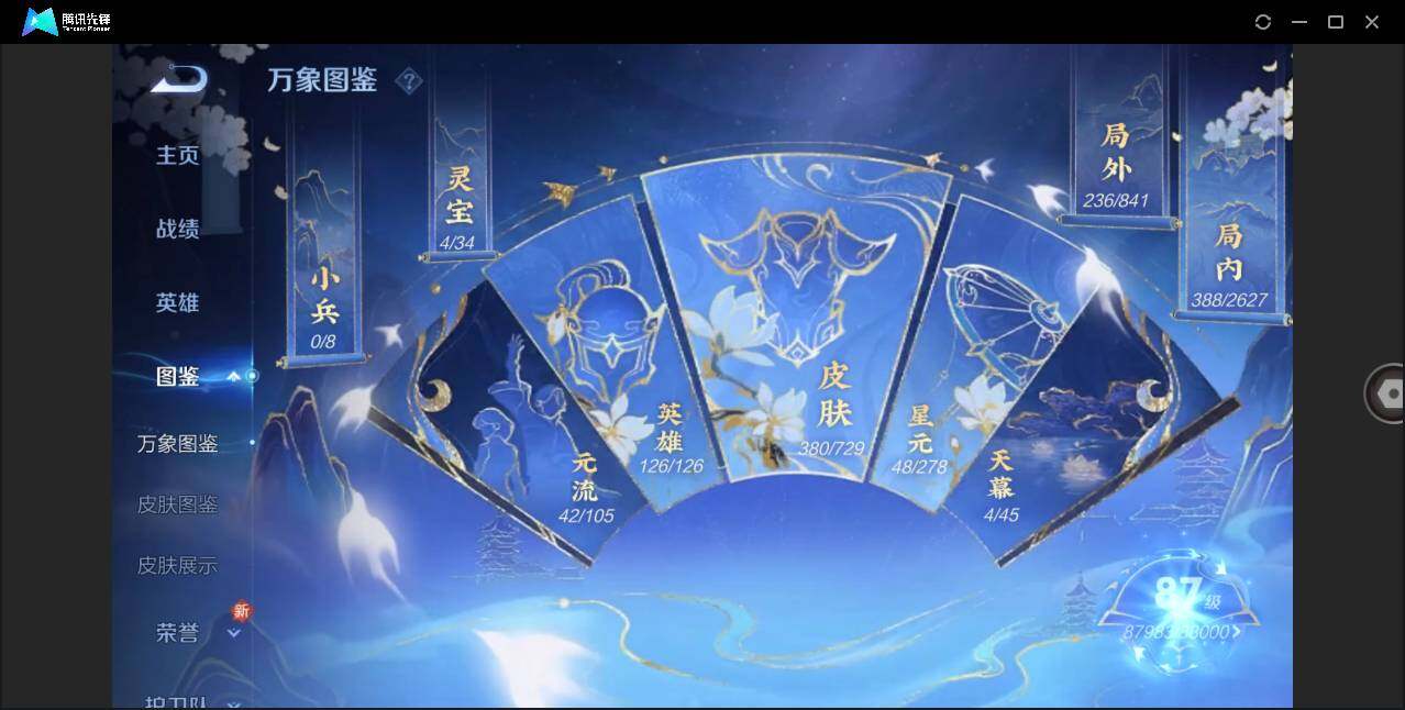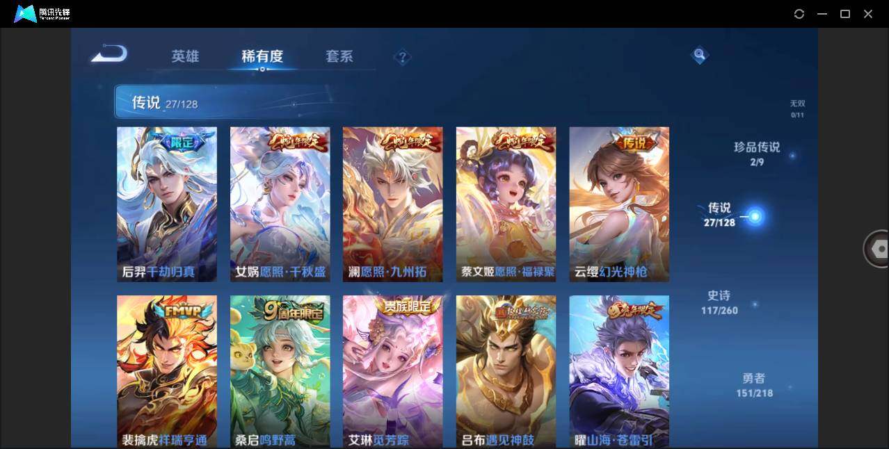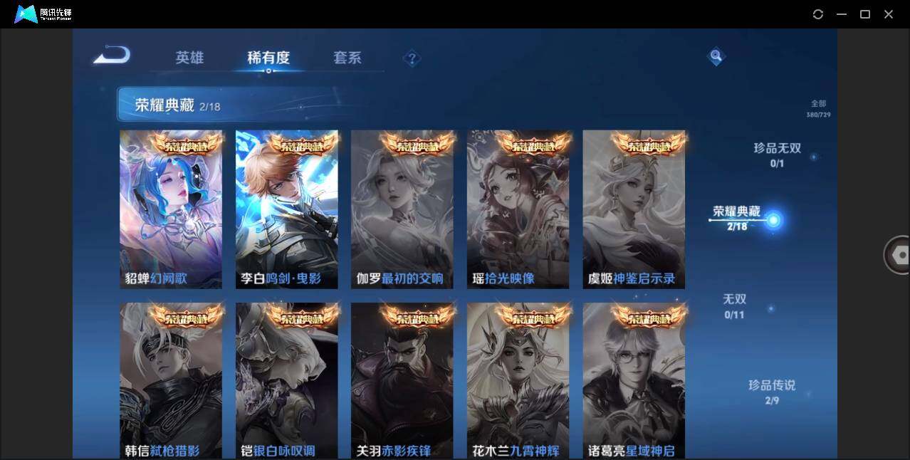 - [12088965]V9 2典藏 27传说 125英雄 363皮肤 典藏英雄武则天 可修改实名 优质装备:天鹅之梦(小乔典藏),大秦宣太后,绛天战甲(鸡嘴战神),黄金白羊座,猫影幻舞,久胜战神,云霓雀翎,地狱火,仲夏夜之梦(大飞蛾),零号·赤焰,海洋之心,飞鸢探春,乞巧织情,游龙清影(小青龙),遇见胡旋,挚爱之约 珍宝阁皮:蔷薇恋人,女武神 限定皮:凤凰于飞,太华(伽罗年限),武陵仙君(小桃花),傲雪梅枪,补天,寅虎·展翼(孙膑年限),时之彼端,白鹤梁神女,魔法小厨娘,白晶晶,时雨天司(水龙头),玄嵩(庄周年限),至美·乘鲤谣,至美·化雀舞,遇见飞天,高山流水,匿光决锋者,五谷丰年,幽恒(沐浴露),天狼运算者,游园惊梦,梁祝,御风骁将(吕布年限),天狼溯光者,逐梦之音,奔雷神使(牛魔年限),祈雪灵祝(雪兔子),天狼绘梦者,李小龙,逐梦之光,如梦令-后羿,霸王别姬-项羽,霸王别姬-虞姬,奇迹圣诞,默契交锋-兰陵王,默契交锋-花木兰,孙行者,猪悟能,天魔缭乱,冰霜恋舞曲,乒乒小将,热情桑巴,女儿国国王,寅虎·御盾(廉颇年限),寅虎·瑞焰(虎皮蛋子),寅虎·心曲(虎婆),寅虎·赤拳(老虎年限),时之祈愿-瑶(瑶传限),无尽星芒 史诗皮:化蝶舞,龙之律动,百相守梦-周瑜,守夜人,紫霞仙子,苍穹之光,电玩小子(小书包),特工魅影,江河有灵,百解令(蒙犽),蒙恬荣光圣徽,偶像歌手,龙骑士(小龙虾),暗夜猫娘,魅语,冰冠公主,青蛇,时之恋人-孙尚香,乱世虎臣,节奏热浪,女仆咖啡,摇滚巨星,水果甜心,绅士熊喵,天才门将,星夜王子,心灵骇客,时之奇旅-安琪拉,功夫厨神,德古拉伯爵,暗隐猎兽者,幽灵船长,鬼剑武藏,心灵战警,舞动绿茵,地狱岩魂,诗语江南,纤云弄巧,繁星吟游(呼啦呼啦),拒霜思,缤纷独角兽,乘风破浪,逐浪之夏,水晶猎龙者,曙光守护者,箭羽风息,唤灵魅影,金属风暴,原初追逐者,圣诞狂欢,圣诞恋歌,鹰眼统帅,魅力维加斯,黎明之约,奇遇舞章,天秀·音浪,寅虎·御盾,千筹问战,无心,未来纪元-赵云